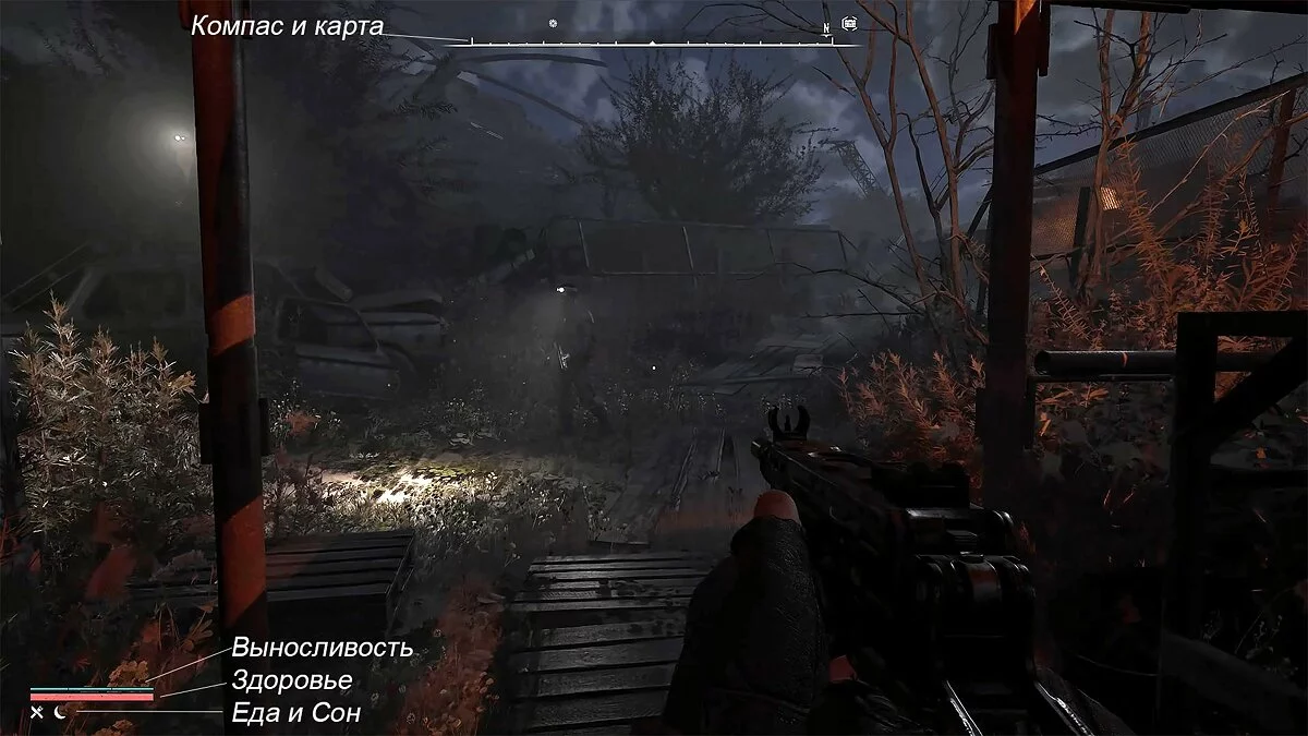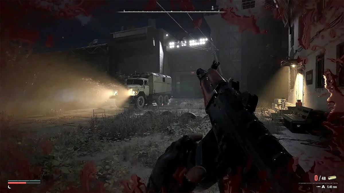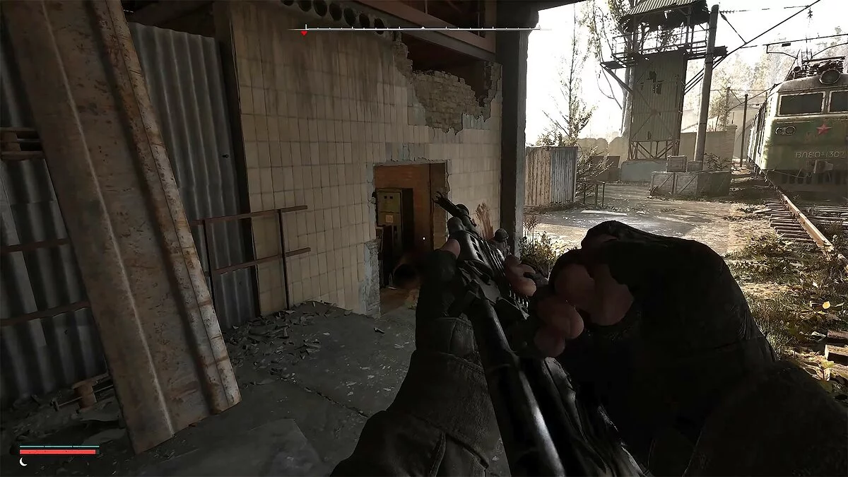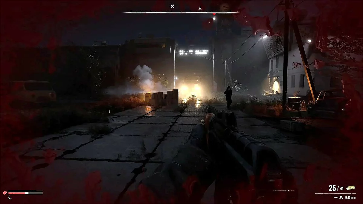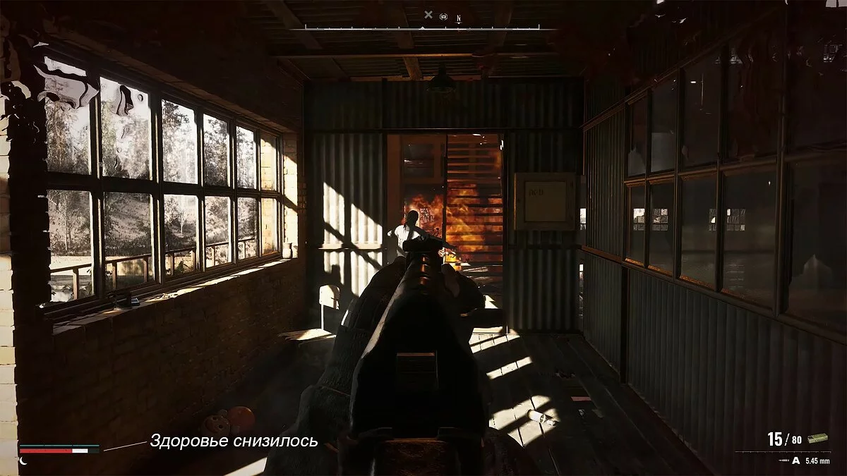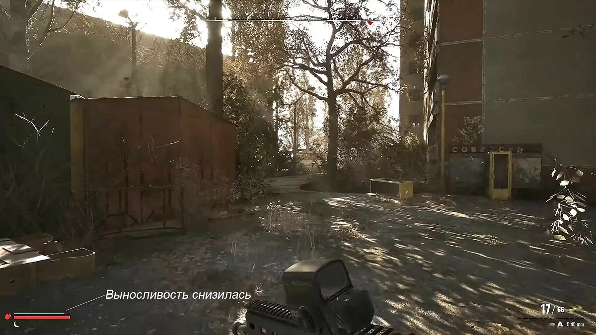 Скиф обзавелся автоматом посовременнее (сразу не узнать, но калибр 5.45, т.е. советский). Сразу ловит маслину от одного из снайперов «Монолита» и прячется в ближайшей постройке, чтобы восполнить здоровье, воткнув стимулятор в стиле той же Apex Legends. Симуляция тут НЕ как в Escape from Tarkov: восстановив здоровье, Скиф резво мчится туда, откуда по нему стреляют.