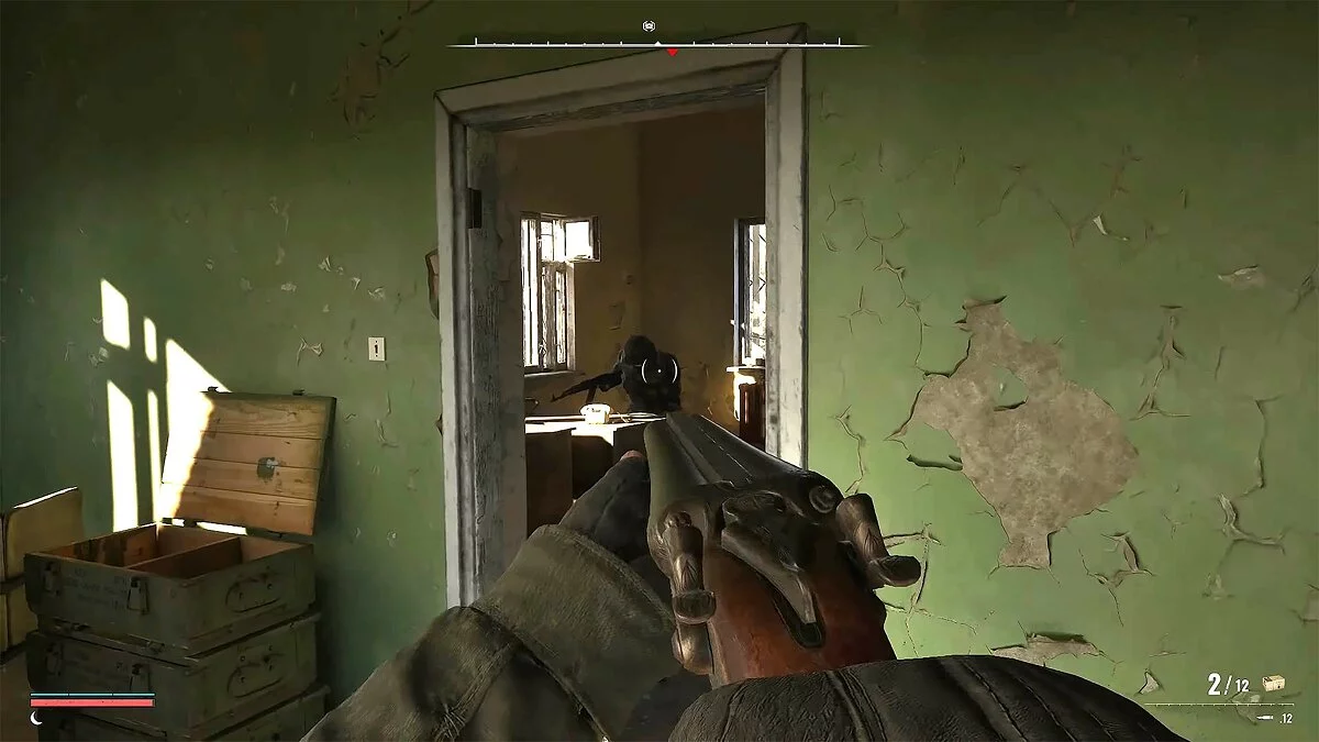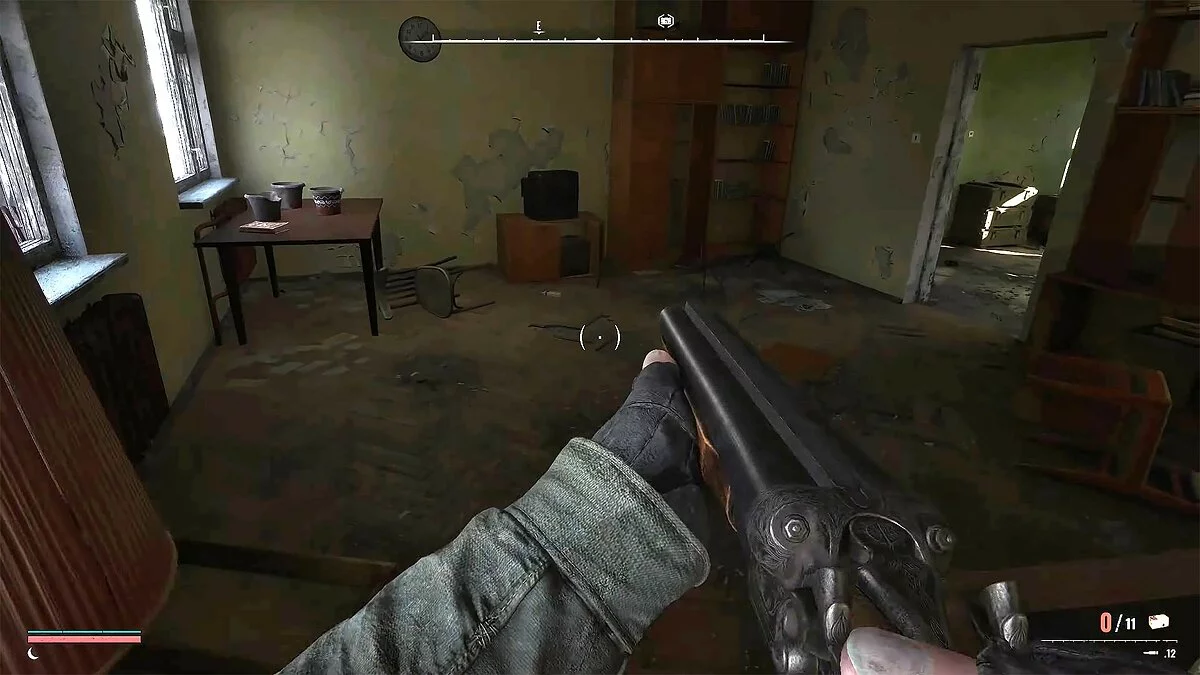 Далее переключаемся на стрельбу в помещениях. В руке героя обрез, поэтому предположим, что мы где-то около периметра Зоны, а это двухэтажная постройка. Но также это могут оказаться казармы военгородка близ «Дуги», которые должны появиться в сиквеле.