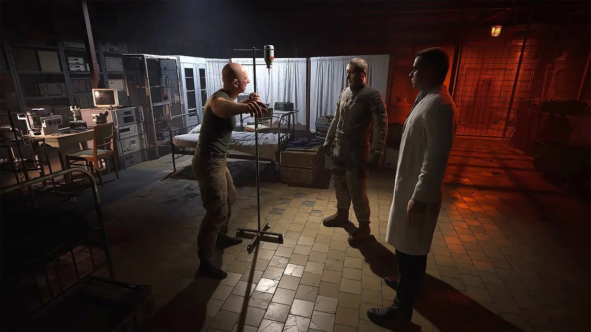 Следующая большая сцена в трейлере — с командиром «Варты», полковником Александром Коршуновым, развернувшаяся на базе этой новой группировки. Арт персонажа уже появлялся в сети, а герой под капельницей очень на него похож.