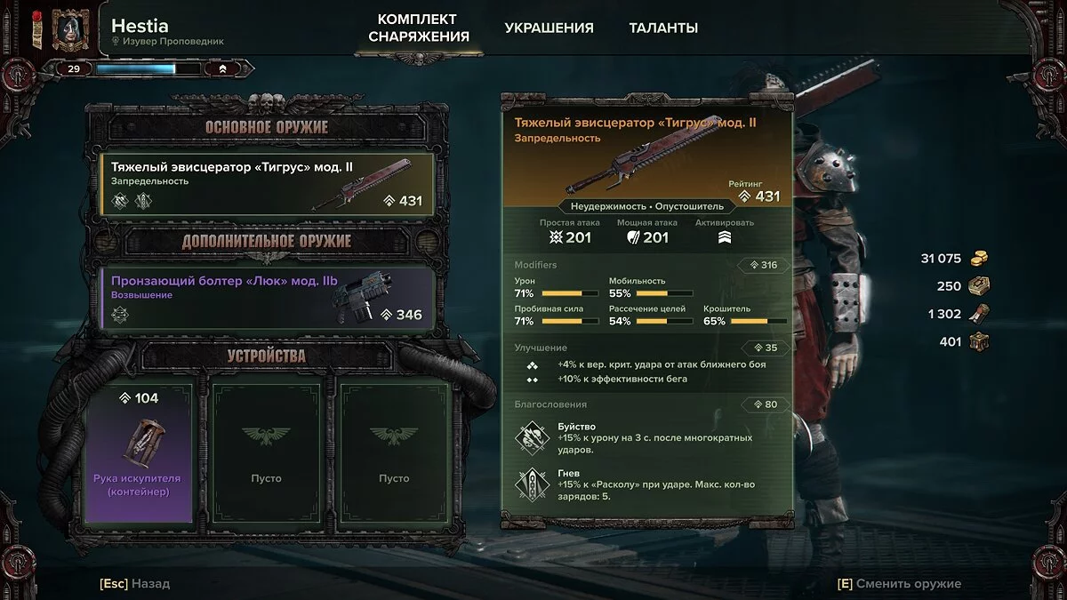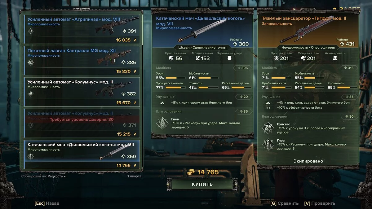 Базовый геймплей Warhammer 40,000: Darktide выверен до мелочей, а вот сессионный геймдизайн явно пострадал от желания разработчиков создать долгоиграющую ММО. Destiny-подобная классификация оружия по уровням редкости заставляет раз за разом покупать одно и то же оружие. Всё ради растущих значений в характеристиках. При этом внешний вид амуниции не меняется. Иногда игроки вынуждены жертвовать своим комфортом и покупать пушки, которые им абсолютно не нравятся. Хочешь не хочешь, а без высоких значений в характеристиках в бою делать нечего.