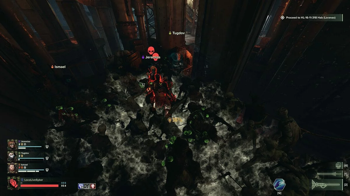 За что безоговорочно хвалят Darktide, так это за боевую систему. Fatshark взяла всё самое лучше из своей Vermintide 2 и адаптировала под Warhammer 40,000 с огнестрелом, еретиками и шизанутыми персонажами. Для тех, кто пропустил вторую Vermintide, напомню: игра без преувеличения считается эталонной наследницей Left 4 Dead. Там были профессиональный ИИ-режиссер, расставляющий противников под игровую ситуацию, орды противников, мини-боссы, черти, которых лучше не беспокоить, и еще десятки выверенных до мелочей особенностей кооперативного экшена.
