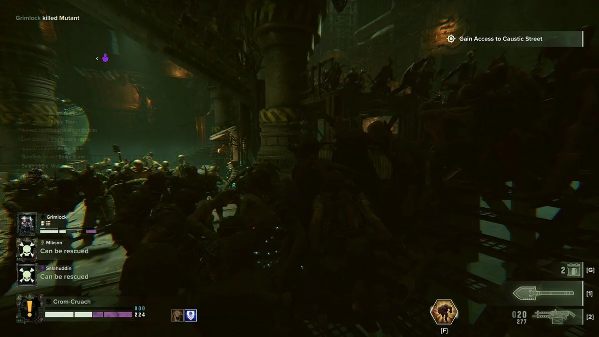 Стрелять в Darktide приходится едва ли не чаще, чем сражаться топорами и бензопилами. На более высоких уровнях сложности противников с пушками и пулеметами становится так много, что игнорировать огнестрельное оружие невозможно. Помимо обычных противников с автоматом наперевес, вас будут постоянно тревожить снайперы, убивающие с пары попаданий, огрины с пулеметами, обычные пулеметчики и минометчики, гренадеры, трапперы и еще целая пачка адаптированных под вселенную Warhammer 40,000 мини-боссов из Vermintide 2. Все эти элитные противники не просто ждут своего часа и появляются в неожиданных местах, а реально прут на вас с огромной толпой обычных миньонов. Просто стоять и рубить мечом всех неверных банально не выходит.