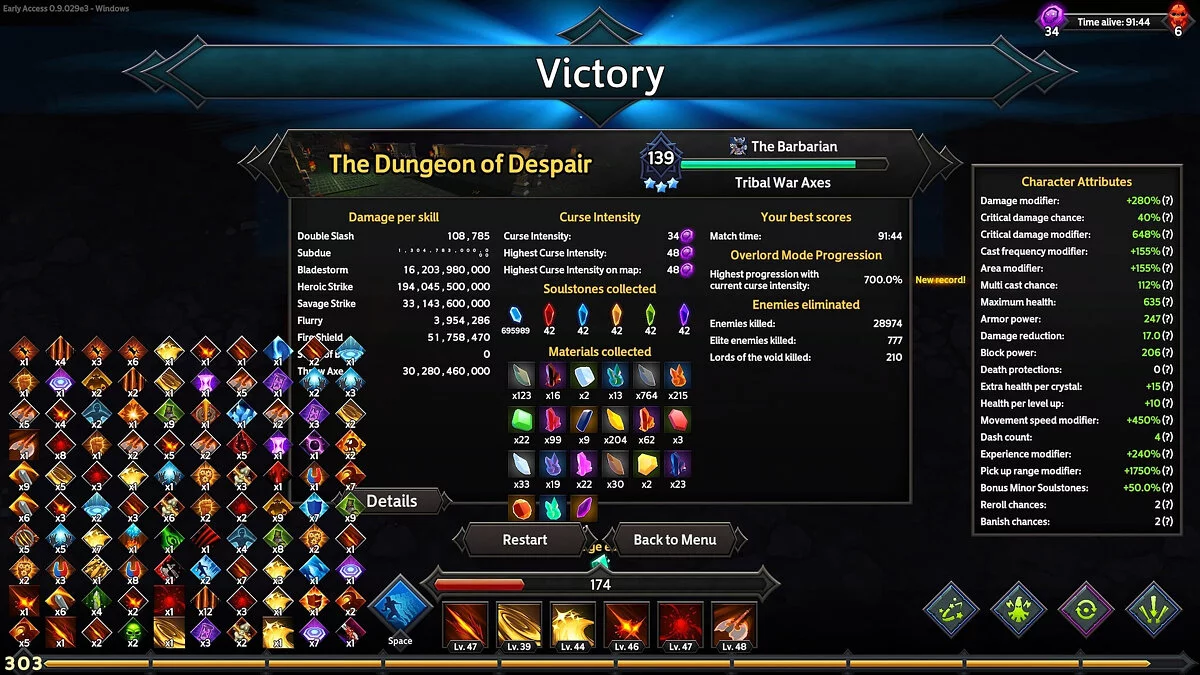 Контента действительно много: 140+ умений, 5 карт, 14 персонажей, 20 видов оружия, меняющих геймплей, а также системы рун, проклятий и древо умений.