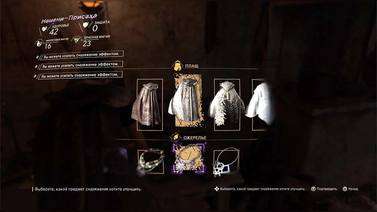 У каждого плаща и кулона есть три дополнительных улучшения, которые вы можете менять по своему усмотрению, а также ряд прокачиваемых параметров. Даже если вы нашли что-то с уже установленной особенностью, ее всегда можно убрать и заменить на свою. Из-за этого становится непонятным, зачем вообще искать другие плащи, ведь всегда можно переделать под себя текущий, да и прокачка не ограничена. Хотя сделать ультимативный наряд все равно не выйдет — больше трех улучшений не добавить.