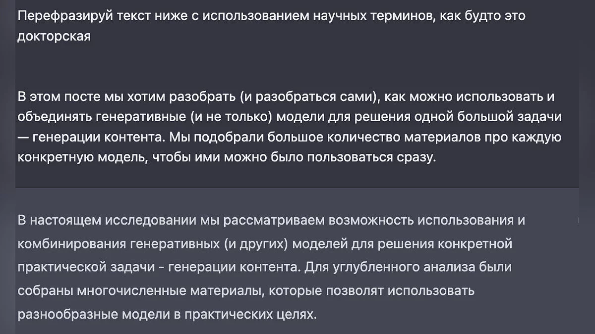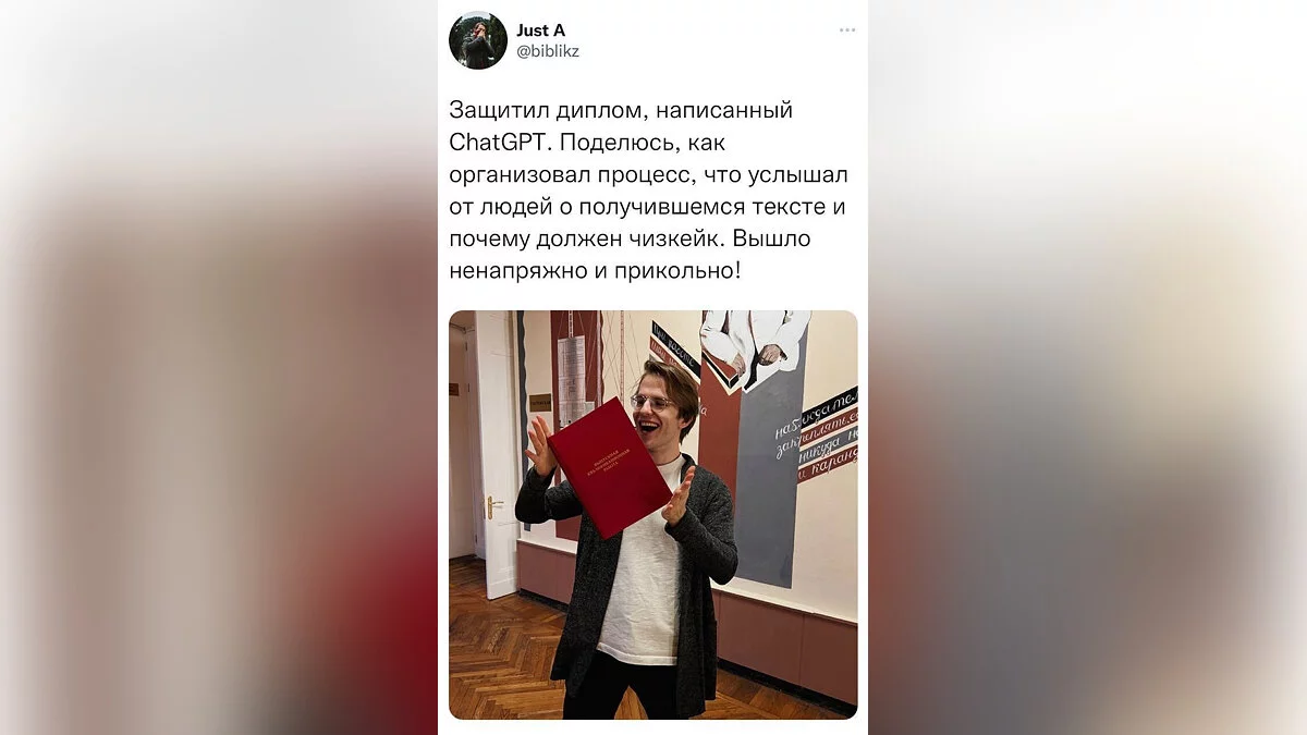 Недавно один из студентов московского вуза за 23 часа написал с помощью ChatGPT диплом, который потом успешно защитил. Сначала он попросил сформировать план диплома по заданной теме, затем — расписать каждый из пунктов. Конечно, пришлось редактировать стилистику текста и править перевод, но зато оригинальность работы составила 83%. И, пожалуй, если бы этот случай не получил огласки в соцсетях, «искусственности» работы никто бы и не заметил.