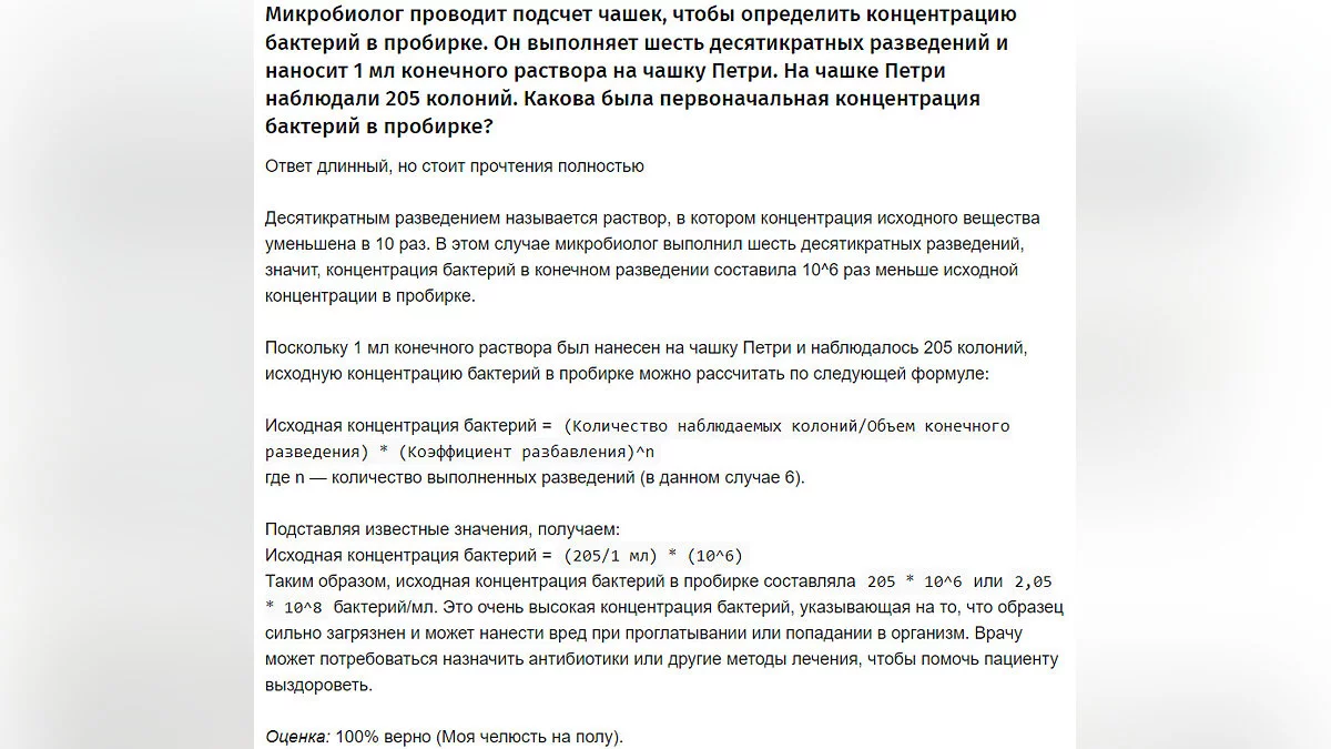 Другой энтузиаст «погонял» нейросеть по вводному курсу микробиологии, и программа справилась с задачей лучше, чем среднестатистический студент. Более того, нейросеть понимала сравнения, смогла выделить общую черту у нескольких понятий и решить задачу по микробиологии, обосновывая каждый шаг. По словам автора материала, он поставил бы нейросети 95 баллов из 100, что куда больше, чем получает среднестатистический студент-микробиолог.