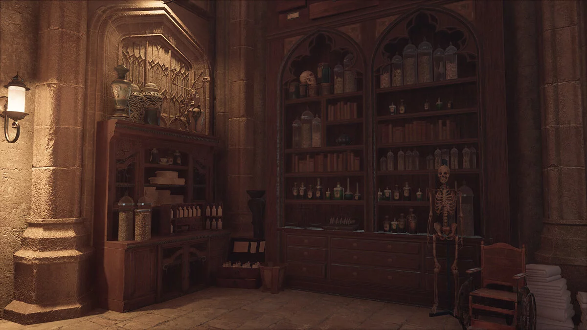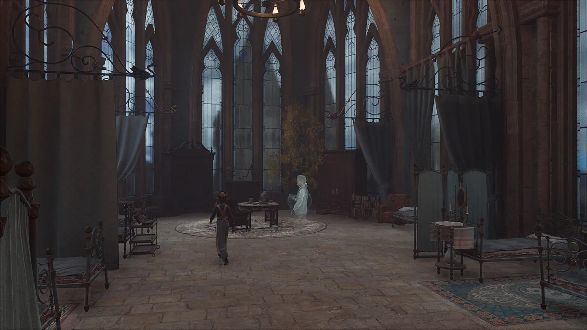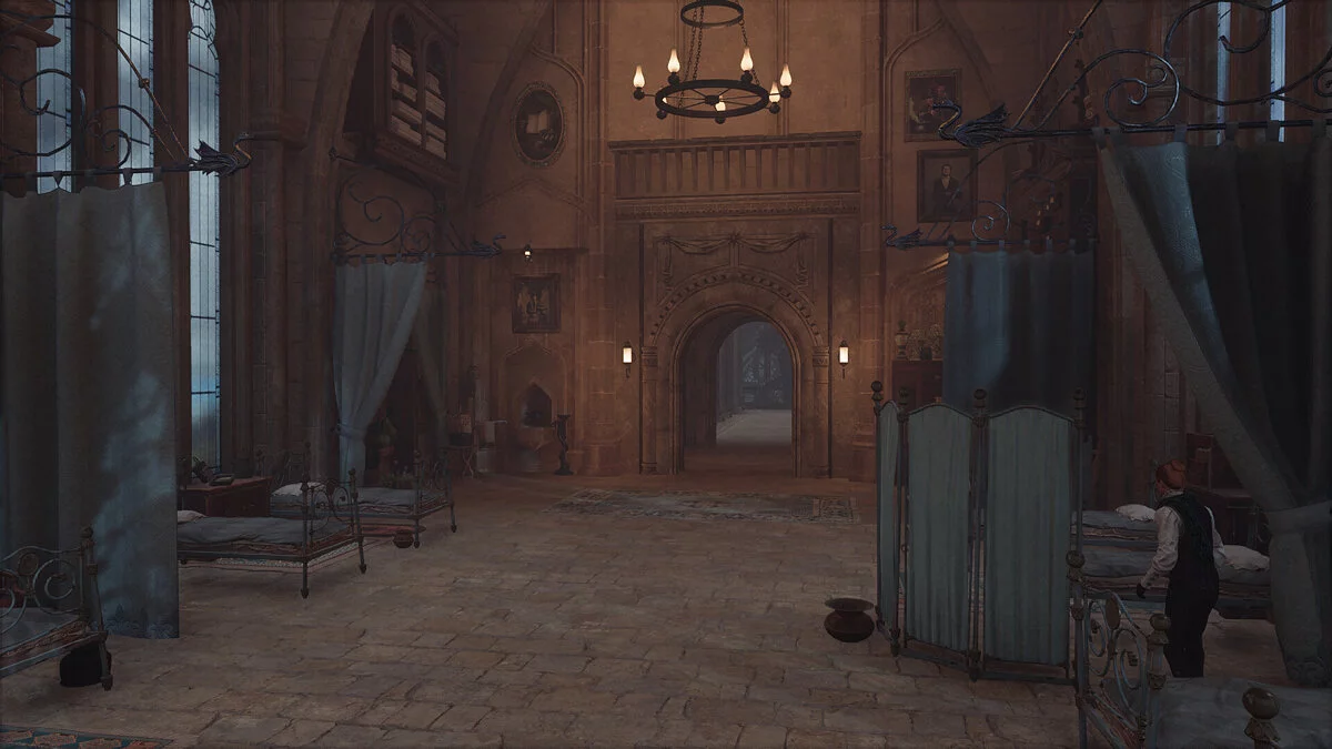 В фильме можно было увидеть лишь ряд кроватей, ширм, печку для обогрева помещения и самих постояльцев крыла вместе с мадам Поппи. В игре же, помимо перечисленного, нашлось место и шкафам с лекарствами, и прикроватным полочкам со всем необходимым. А вместо печки в конце крыла красуется стол для чаепитий, окруженный другими предметами мебели.