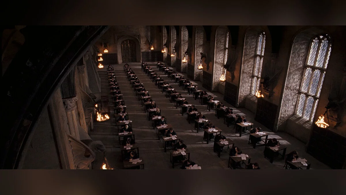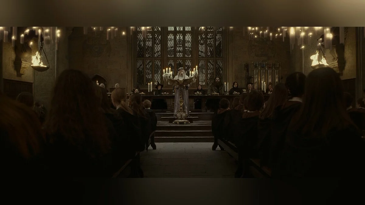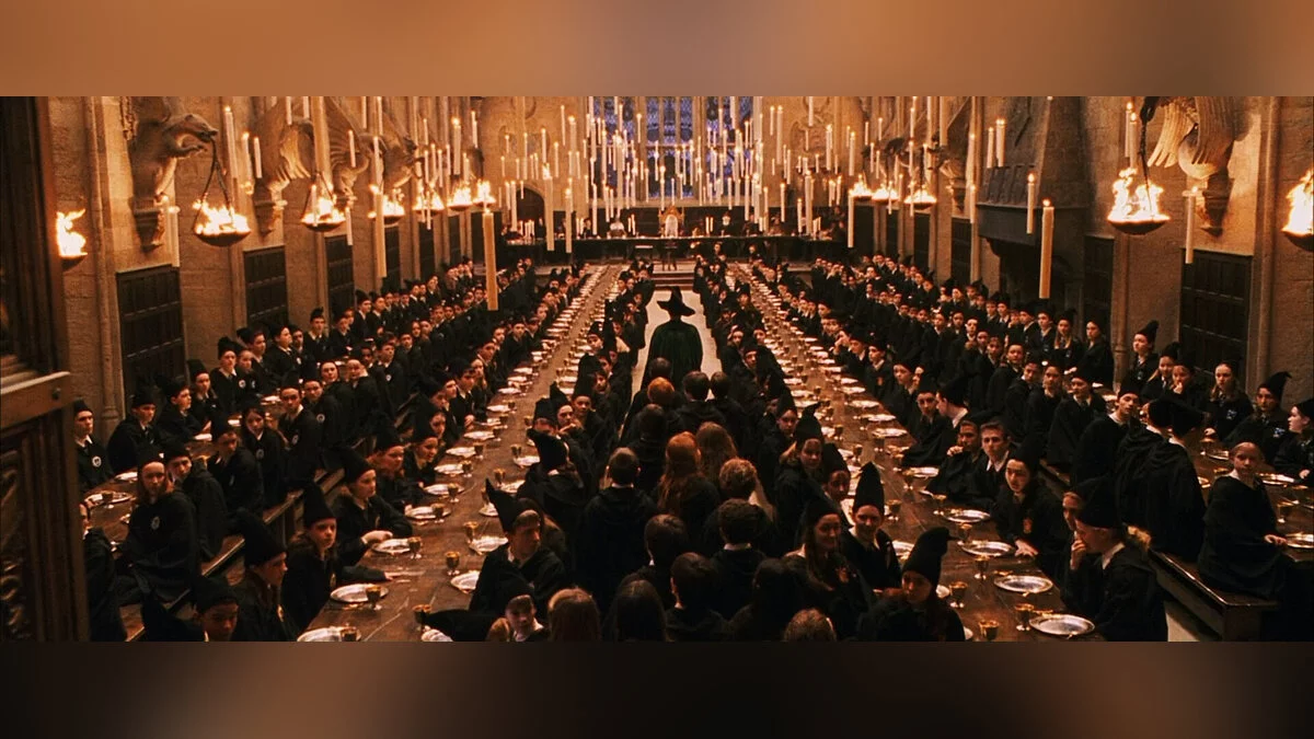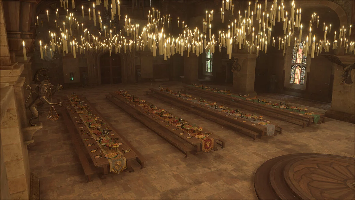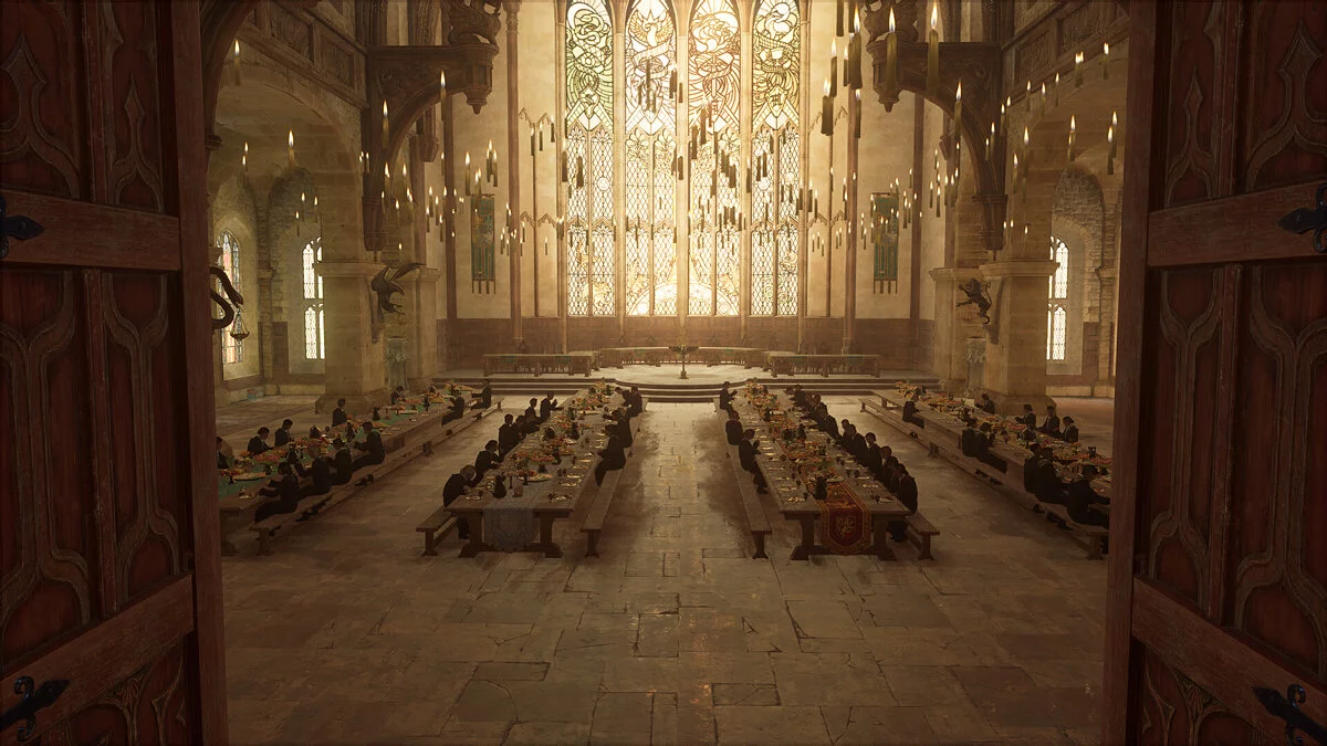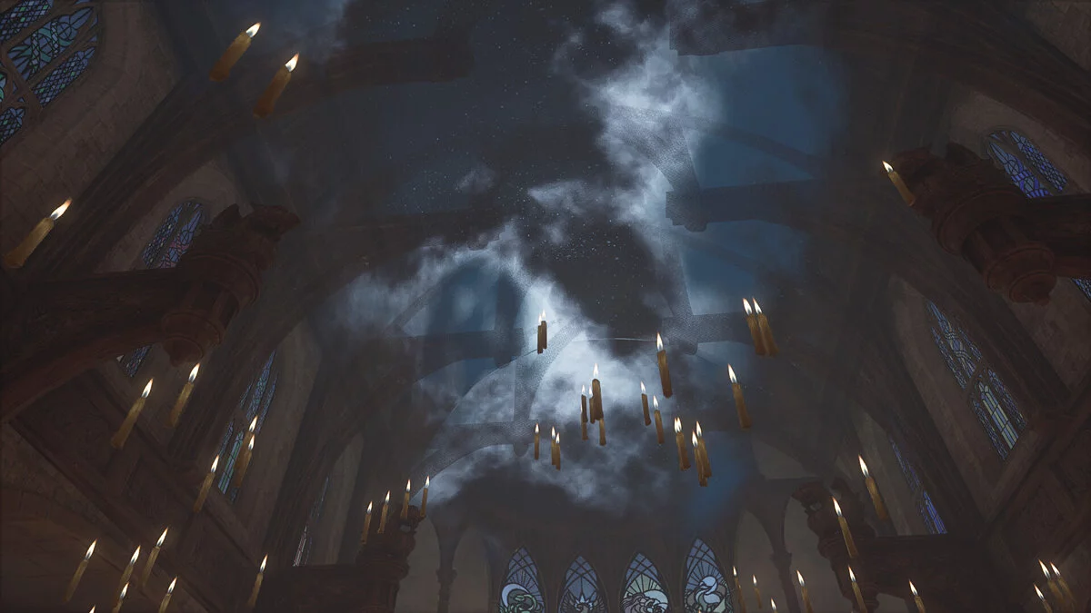 Большой зал прекрасно иллюстрирует то, как разработчики переносили локации из книг и фильмов в свой проект. Все отличительные черты на месте: зачарованный потолок, летающие свечи, столы факультетов, та самая «дверь в волшебный мир», с открытия которой начинается сцена распределения.