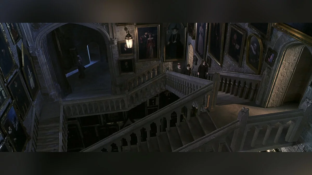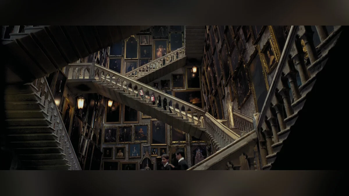 В фильмах и предыдущих играх о Гарри Поттере пространство с лестницами имело прямоугольную форму. Сами лестницы были прямыми и свободно парили в воздухе, перестраиваясь прямо со студентами «на борту». Иногда это создавало неудобства, вроде своевольного поведения лестницы в первом фильме, когда та отправила Гарри прямо к Запретному коридору на третьем этаже.