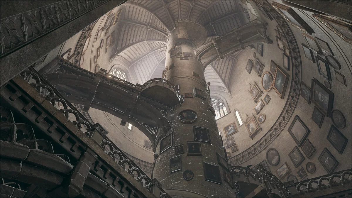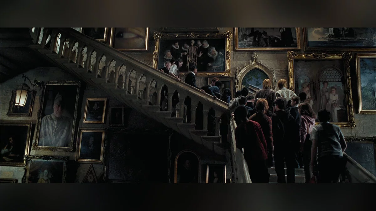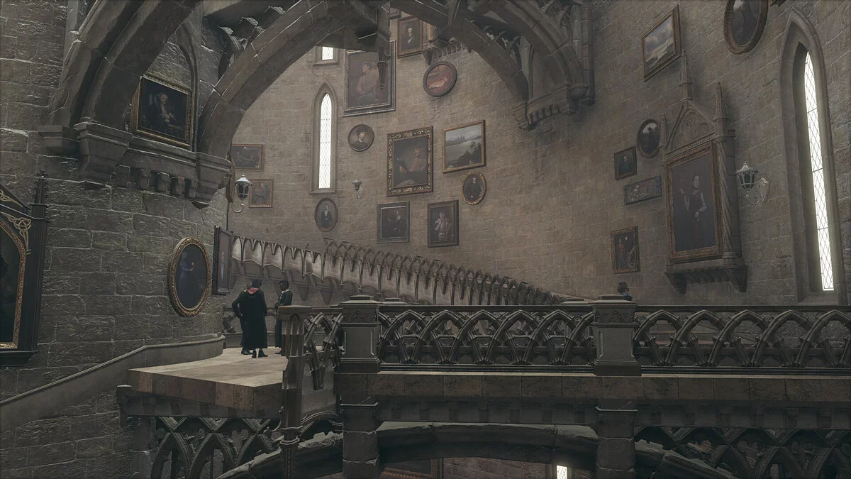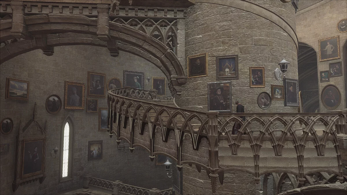 В Hogwarts Legacy от этого отказались. Помещение с лестницами теперь имеет круглую форму, с каменным цилиндром посередине. Его опоясывают винтовые лестницы или, опять же, «винтом» идут вдоль внешних стен. Пусть это непривычно, но, пожалуй, гораздо удобнее — лестницы появляются под ногами и исчезают, если не требуются, давая обзор на висящие картины.
