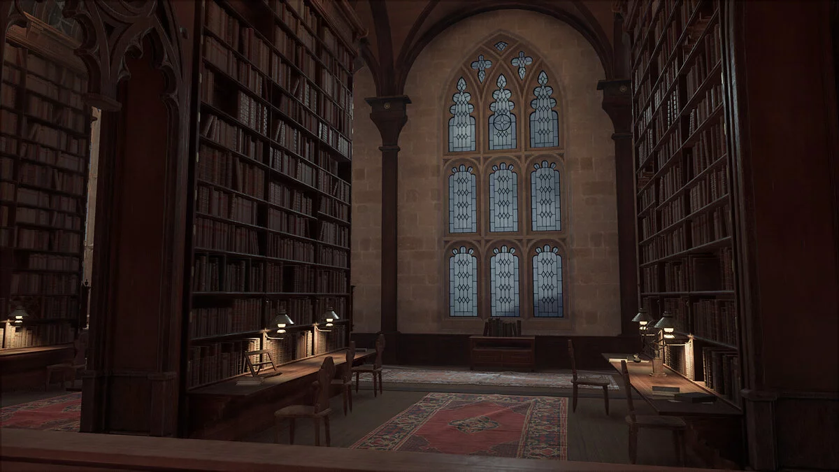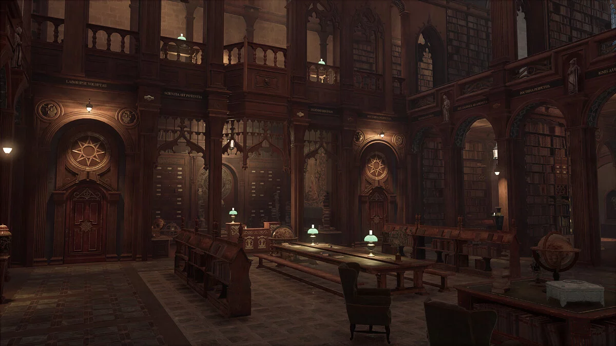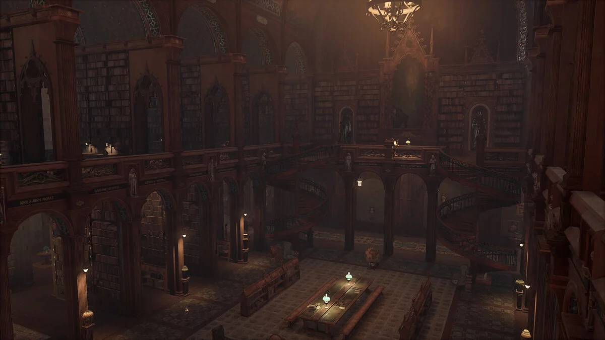 Если ориентироваться на эти черты, Hogwarts Legacy прекрасно справилась с «переносом» библиотеки из фильмов. Это большое и просторное помещение, состоящее из двух этажей. По его периметру расставлены книжные шкафы, которые чередуются с зонами для чтения. В центре можно найти широкие письменные столы, предназначенные для работы с книгами и выполнения домашних заданий.