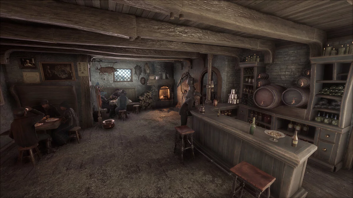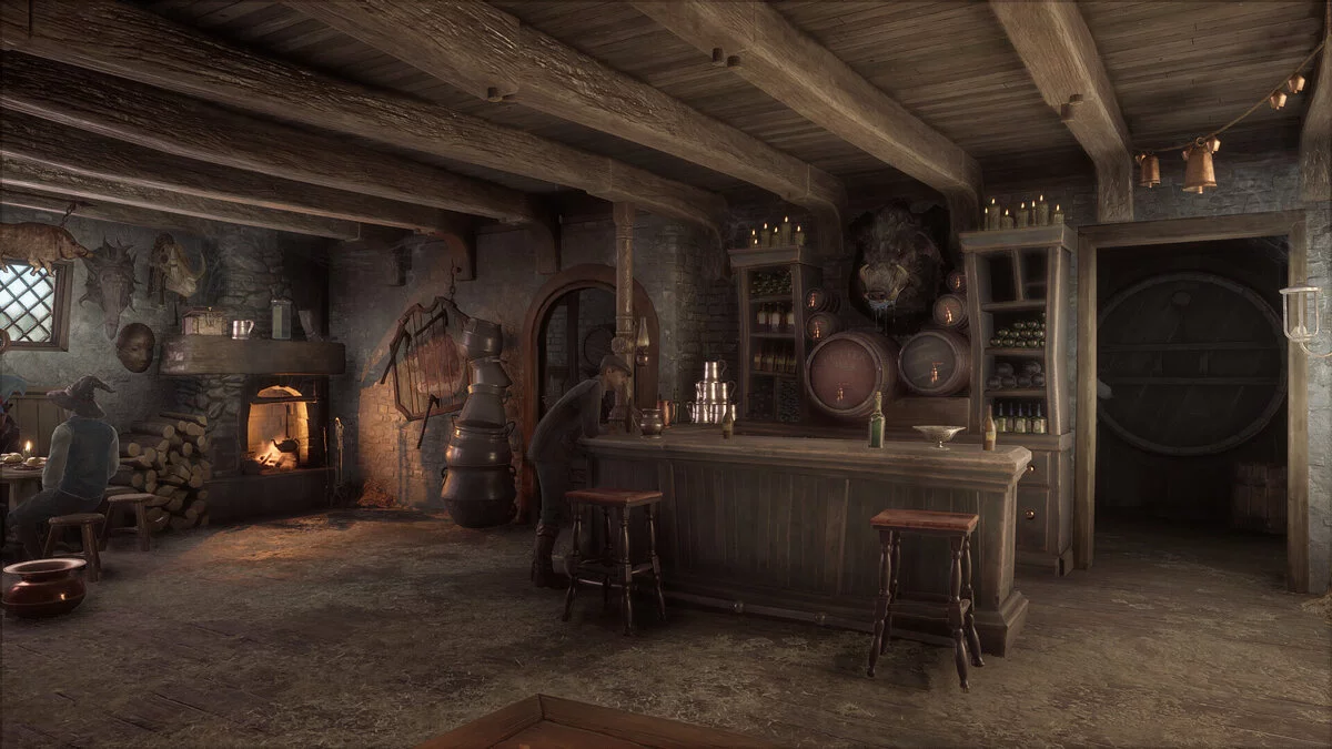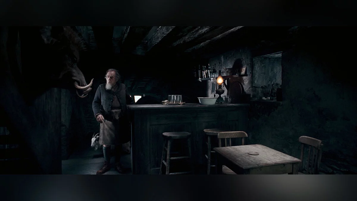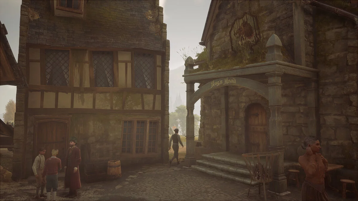 В игре же Кабанья голова расположена в самом Хогсмиде, пусть и в тупике ничем не примечательной улочки. Места здесь меньше — всего три столика и барная стойка с подозрительными посетителями за ней. А вот кабанья голова, висящая над баром, в отличии от фильма, живая.