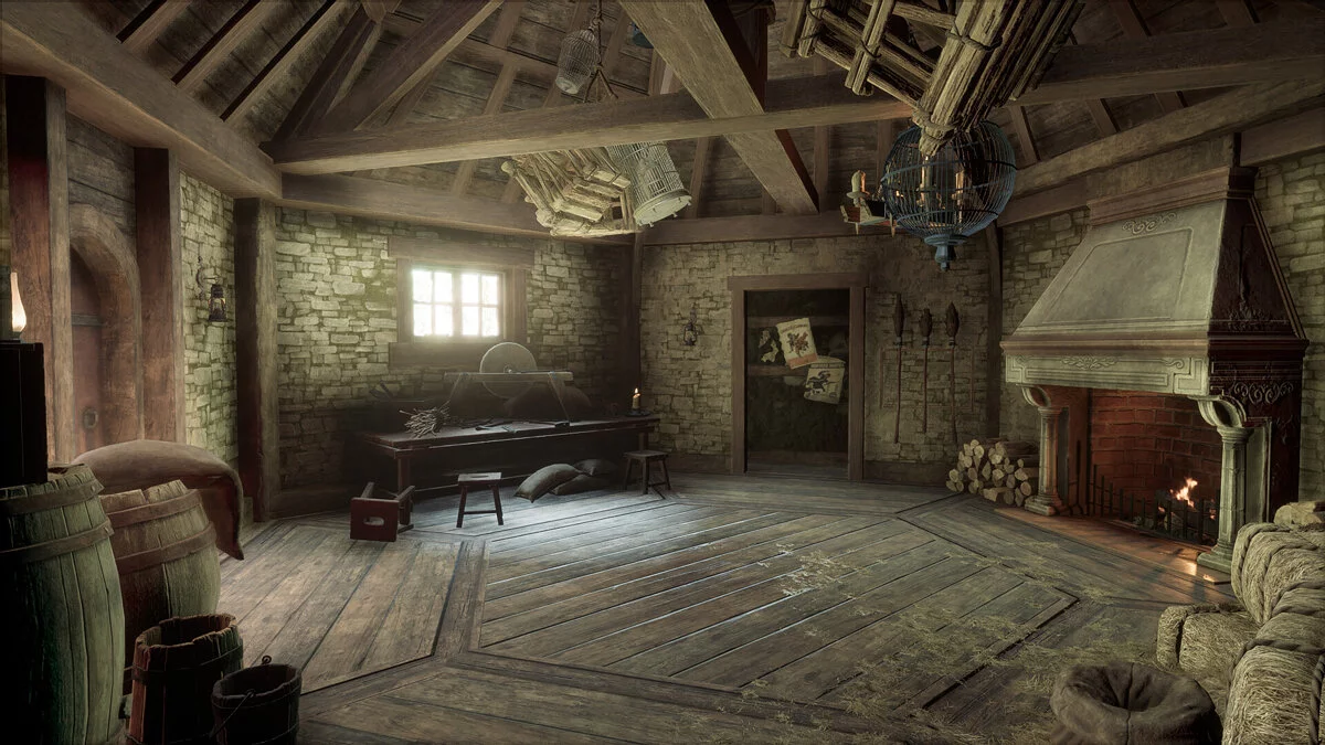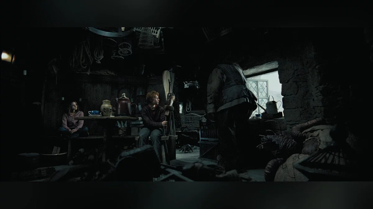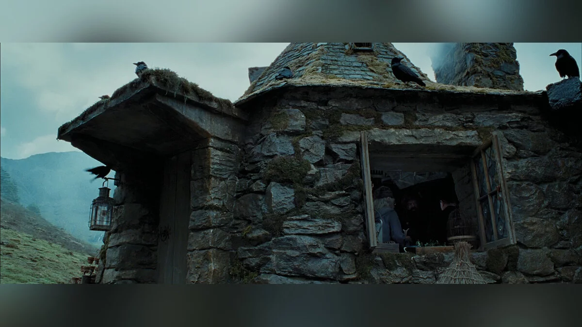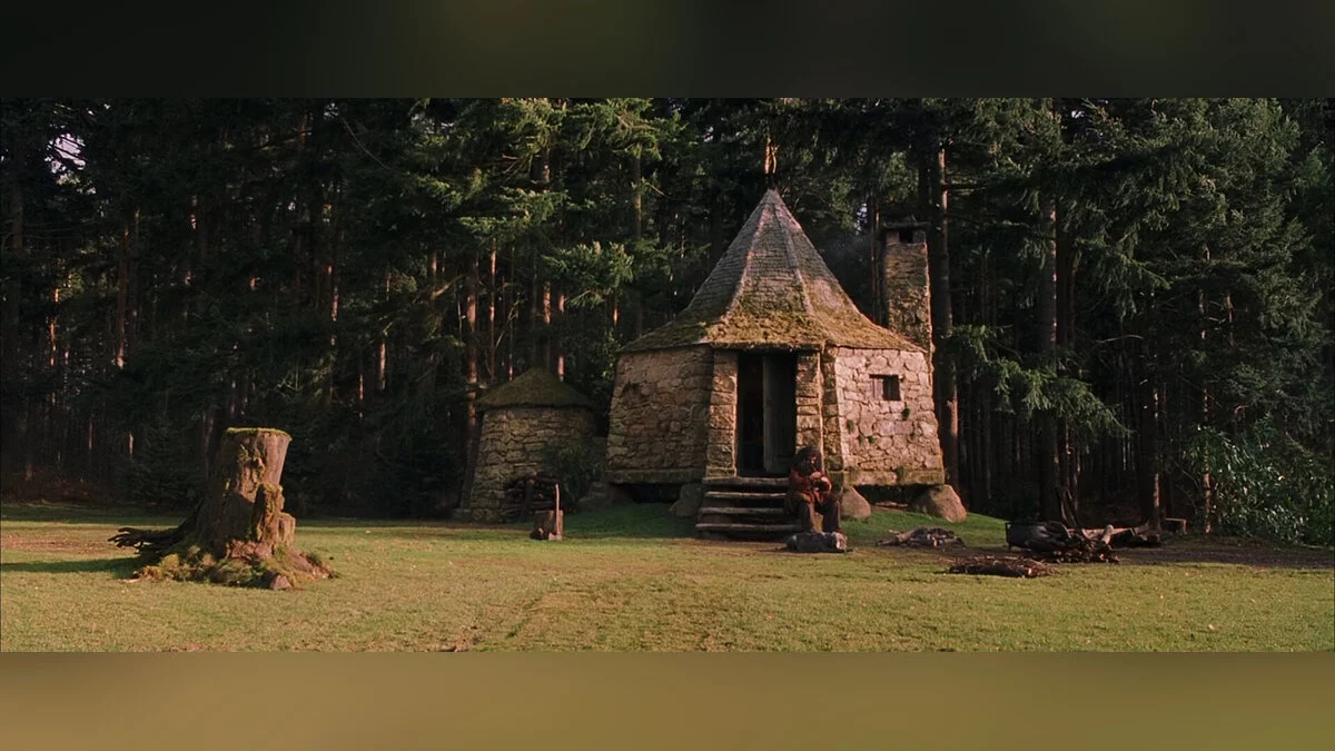 В игре хижина выглядит скромнее — это небольшое каменное строение, почти пустое внутри. Видимо, столетие спустя Хагрид основательно обустроил свою обитель, сделав ту пригодной для жизни: расставил мебель, «вырубил» окно, сделал пристройку.