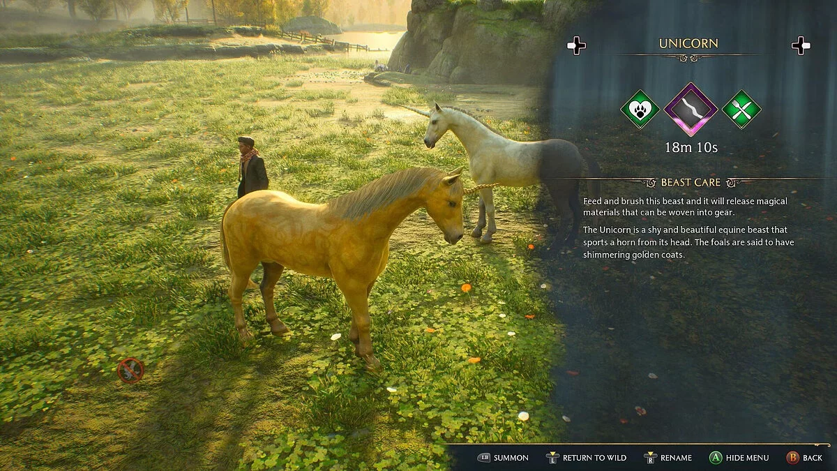 В игре мы можем встретить и даже приручить этих существ с помощью хвать-мешка, после переместив их в собственный виварий. Единороги обитают только в одном месте, западнее верхнего Хогсфилда.