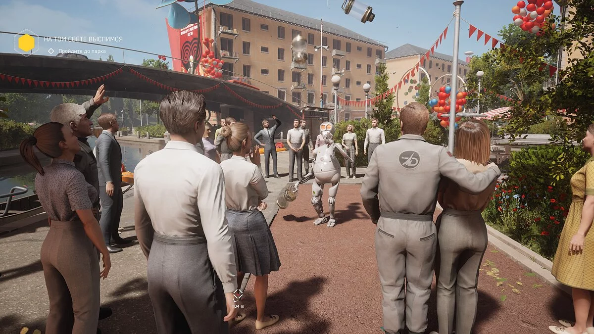 Одновременно с этим открывающая мирная сцена очень красочная. Графика в Atomic Heart не хватает звезд с неба, но смотрится приятно. Сочные цвета, хорошая дальность прорисовки и множество мелких деталей на месте. Частота кадров при этом держалась стабильно даже в бою, во всяком случае, у нас. Хотя, судя по тестовым видео с консолей в интернете, у многих падала до 30.