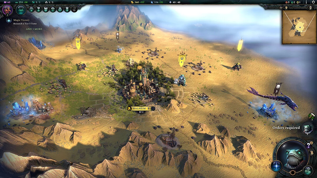Попав на карту мира, вы ощутите дежавю, если ранее играли в Heroes of Might and Magic и Civilization. У вас есть начальный город, где можно возводить новые здания, производить юнитов и проводить исследование улучшений. В дальнейшем придется расширять территорию поселения, присоединяя ближайшие земли: растущему населению требуется больше места. На первых порах приходится тщательно изучать структуру города, следить за постройками ферм, шахт и другой инфраструктуры, чтобы в дальнейшем погрузиться в исследование мира и не отвлекаться на градостроительную рутину. При этом игра не шибко лояльна к игрокам, которые любят часами топтаться на одном месте, изучая все доступные улучшения за один раз. Незваные гости нагрянут в ваш город очень скоро.