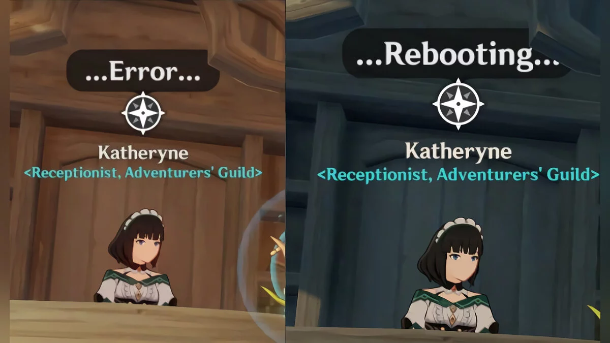 При этом Катерина встречает нас в каждом новом регионе игры, а на вопрос Путешественника о том, как она сюда попала, лишь отшучивается. Подозрения игроков усилились из-за странных реплик NPC. Если некоторое время стоять рядом с Катериной, над головой у неё начнут появляться реплики «Ошибка…» и «Перезагрузка…».