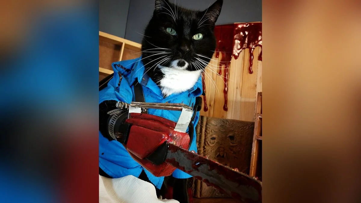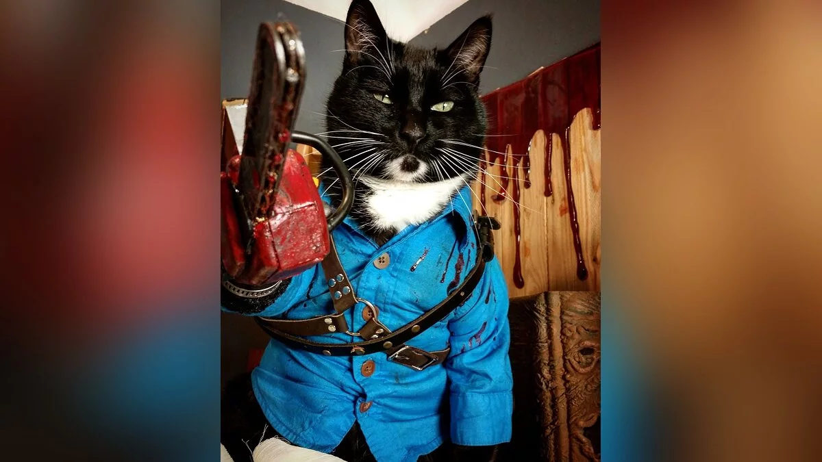 «Зловещие мертвецы» (Evil Dead) — классическая серия ужастиков с элементами комедии от Сэма Рэйми (Sam Raimi). Котейка сделал косплей на Эша, главного героя оригинальной трилогии. Хозяева даже прикрутили к нему миниатюрную бензопилу. Таким инструментом актёр Брюс Кэмпбэлл (Bruce Campbell) крошил оживших мертвецов.