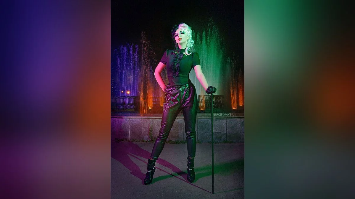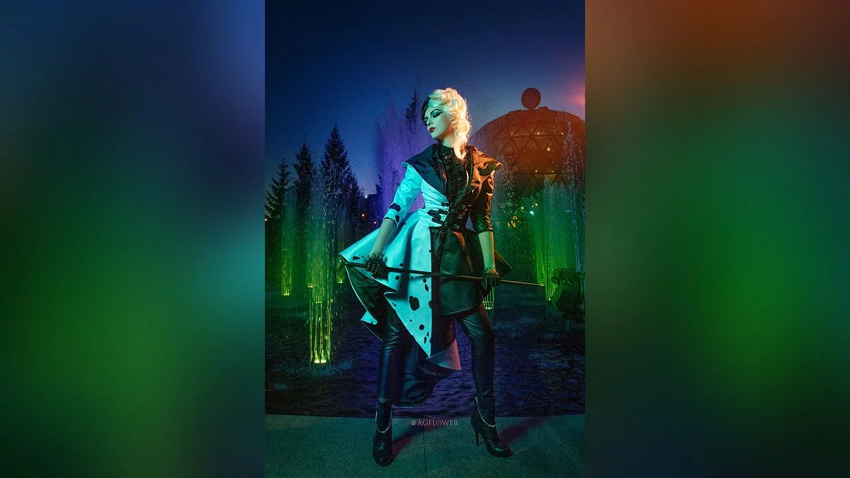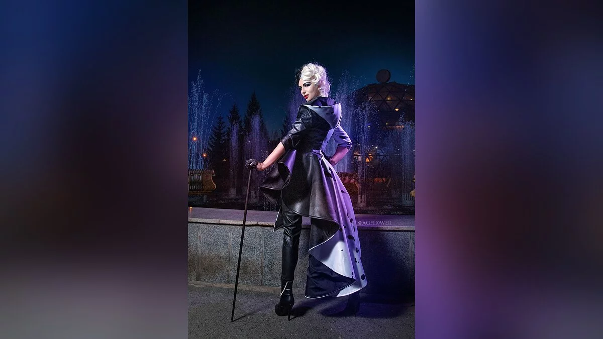 Это мой второй косплей на Круэллу. Я планирую провести ещё несколько фотосетов в этом образе. Здесь мы обыграли сцену из фильма с модным показом, который проходил около фонтана.