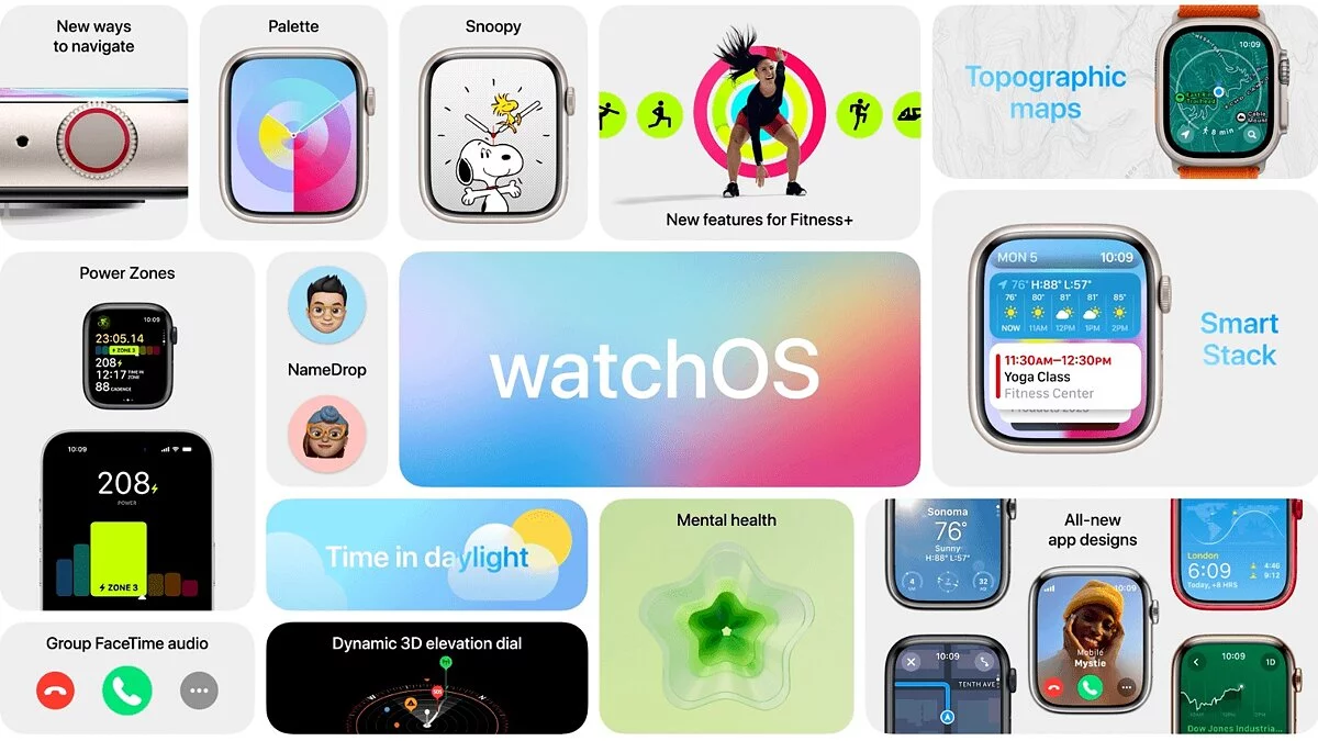 Операционная система для Apple Watch получит новые жесты управления с помощью колёсика, расширенную кастомизацию, новые циферблаты, новые функции для «спортивного режима», а также приложение для заботы о здоровье и зрении. Станет доступна осенью 2023 года.