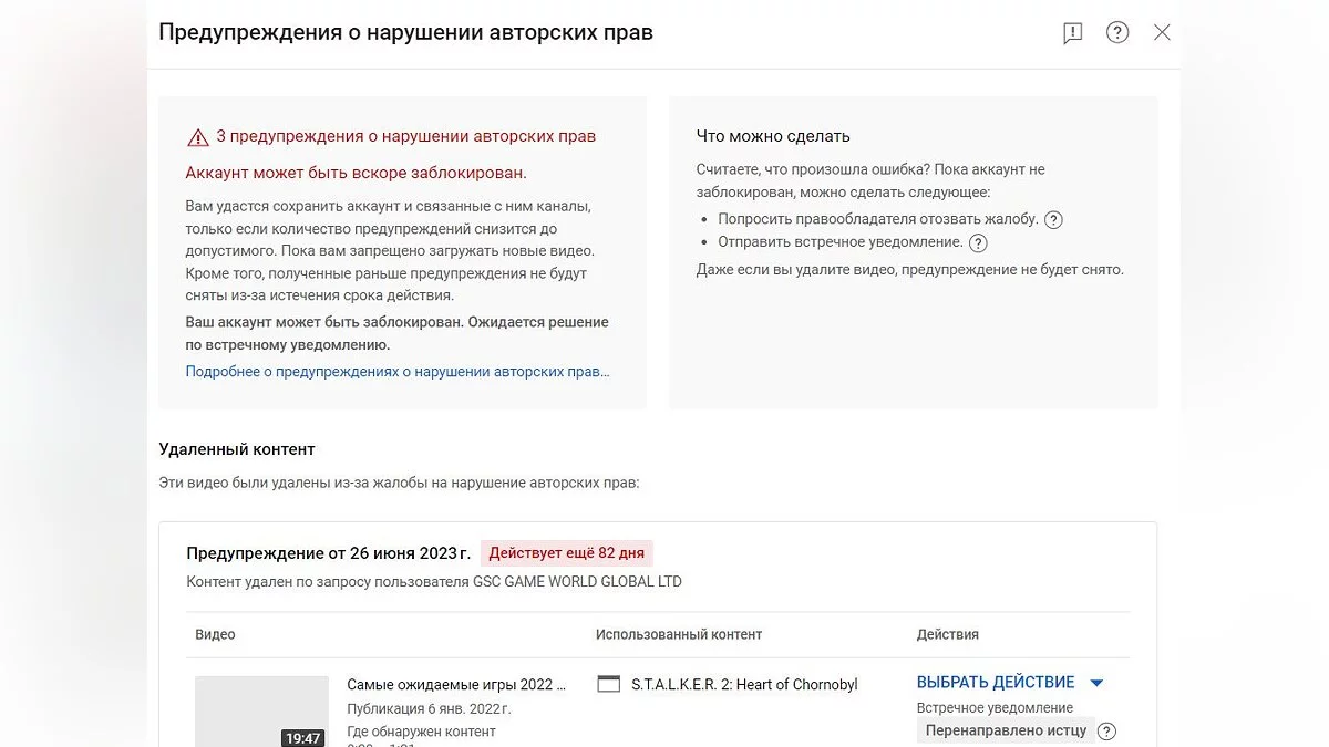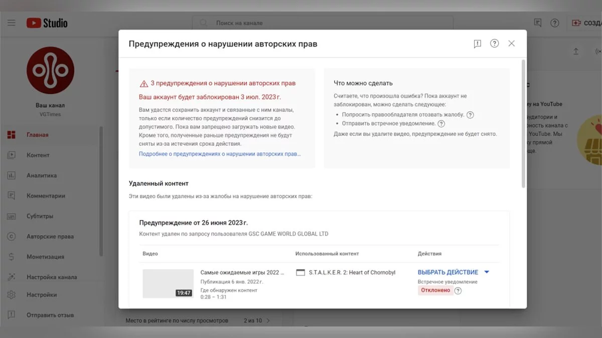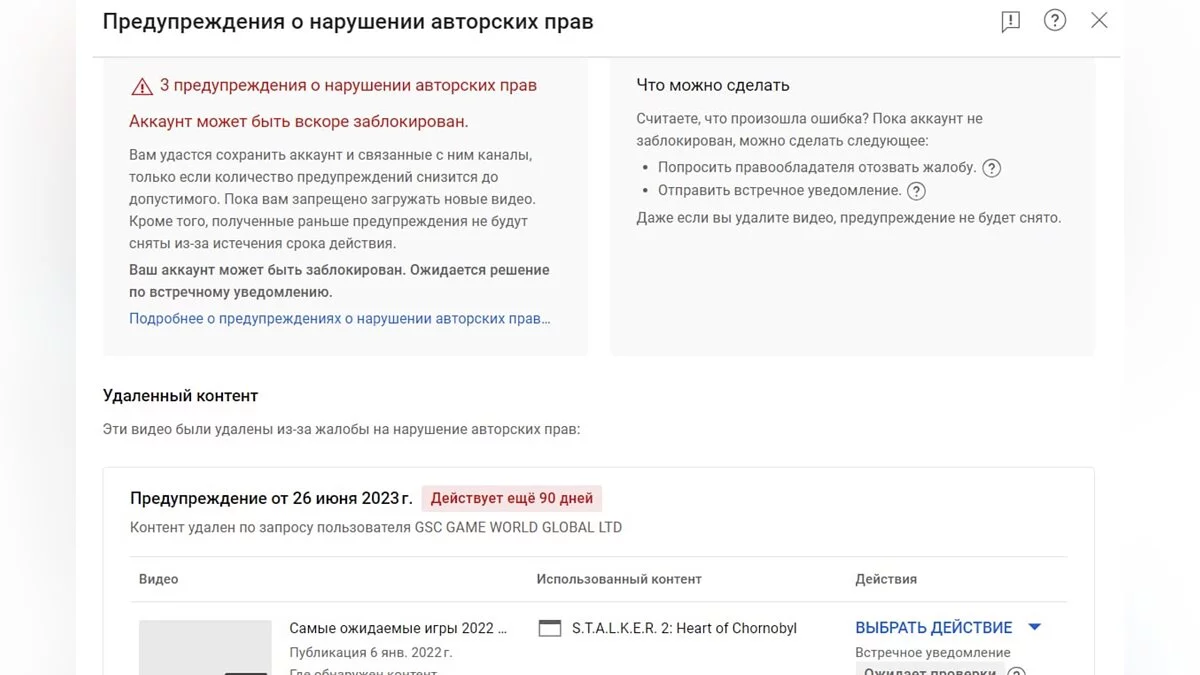 Первая попытка призвать к справедливости провалилась с треском. Страйки не были отозваны, в GSC Game World Global LTD очевидно не сделали ничего, чтобы повлиять на ситуацию, а все три встречных уведомления с нашей стороны YouTube отклонил без каких-либо пояснений. Сообщение в творческой студии гласило: ваш аккаунт будет заблокирован 3 июля.
