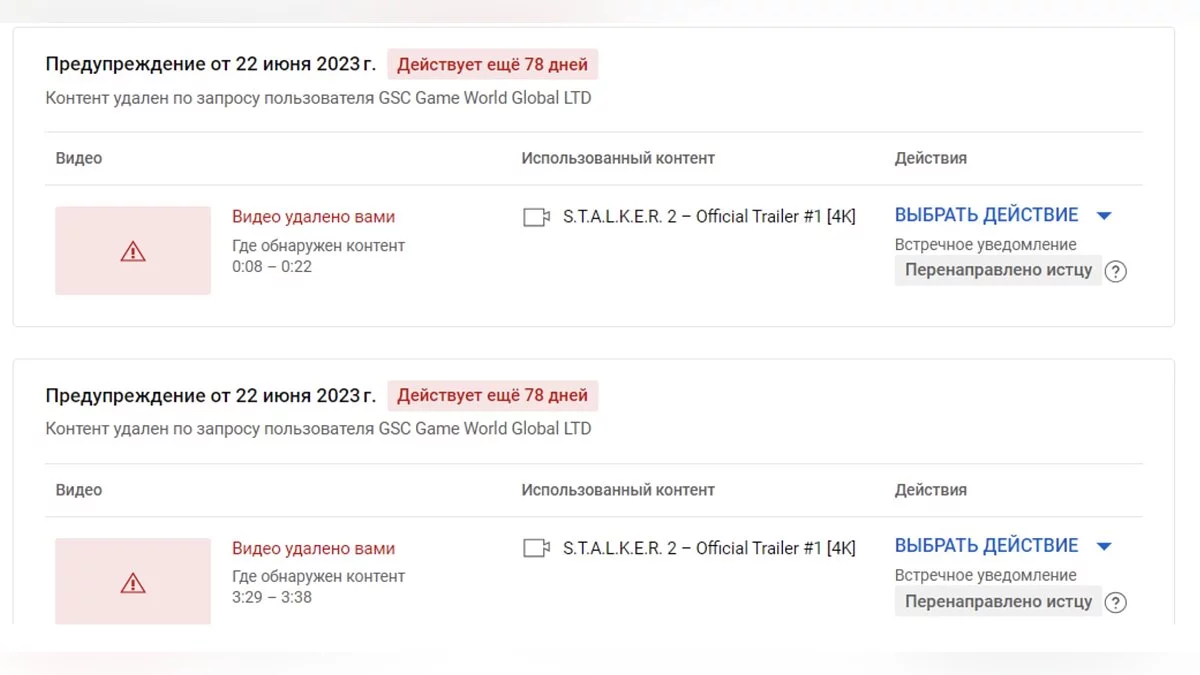 Не будем подробно останавливаться на всех нюансах завязки ситуации, можете прочитать об этом в статье-разборе, лишь коротко пройдемся по этапам. Начиная с 20 июня некоторые YouTube-каналы русскоговорящих СМИ (включая нас) начали получать страйки за нарушения авторских прав. Некто под именем Роман подал жалобы на видео, где использовались официальные трейлеры и общедоступные материалы по «Сталкер 2». Ролики были сделаны еще на этапах анонсов, а значит уже довольно давно висели у нас на странице.