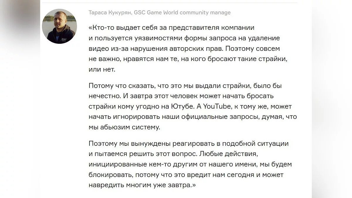 Ни слова о S.T.A.L.K.E.R., или Кто кидает страйки на видео русскоязычных каналов от имени GSC Game World? Разбор VGTimes -