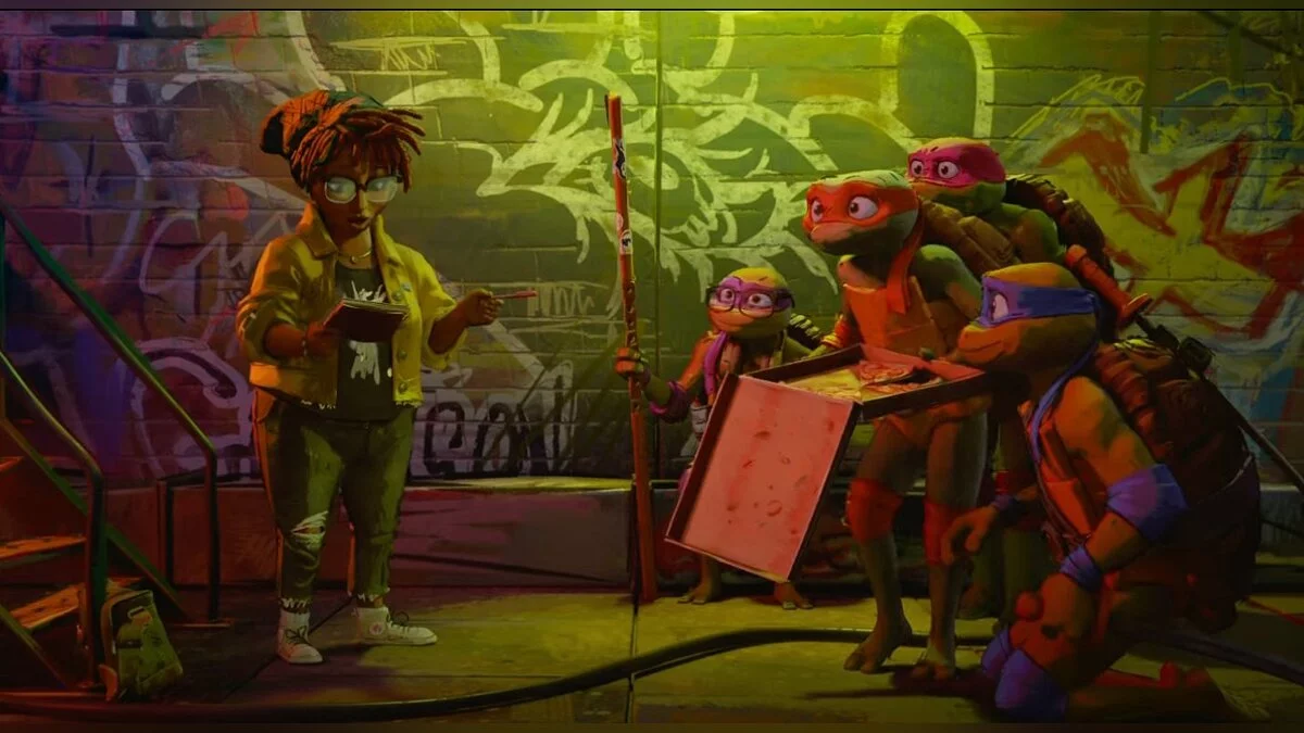 Первое, на что вы обратите внимание сразу после начала просмотра — стиль рисовки. Мультяшные приключения Майлза Моралеса от Sony задали новый тренд на необычный визуал, однако «Погром мутантов» выглядит странно даже по меркам ленты «Человек-паук: Паутина вселенных» (Spider-Man: Across the Spider-Verse). Все, кроме черепах и Сплинтера, нарочито угловатые, некрасивые и отталкивающие. Особенно досталось моделькам людей. Это отчасти вплетено в историю, ведь для крысы и черепашек внешний мир за пределами канализации всегда казался враждебным и агрессивным. Однако наблюдать за целым городом настоящих уродов странно.