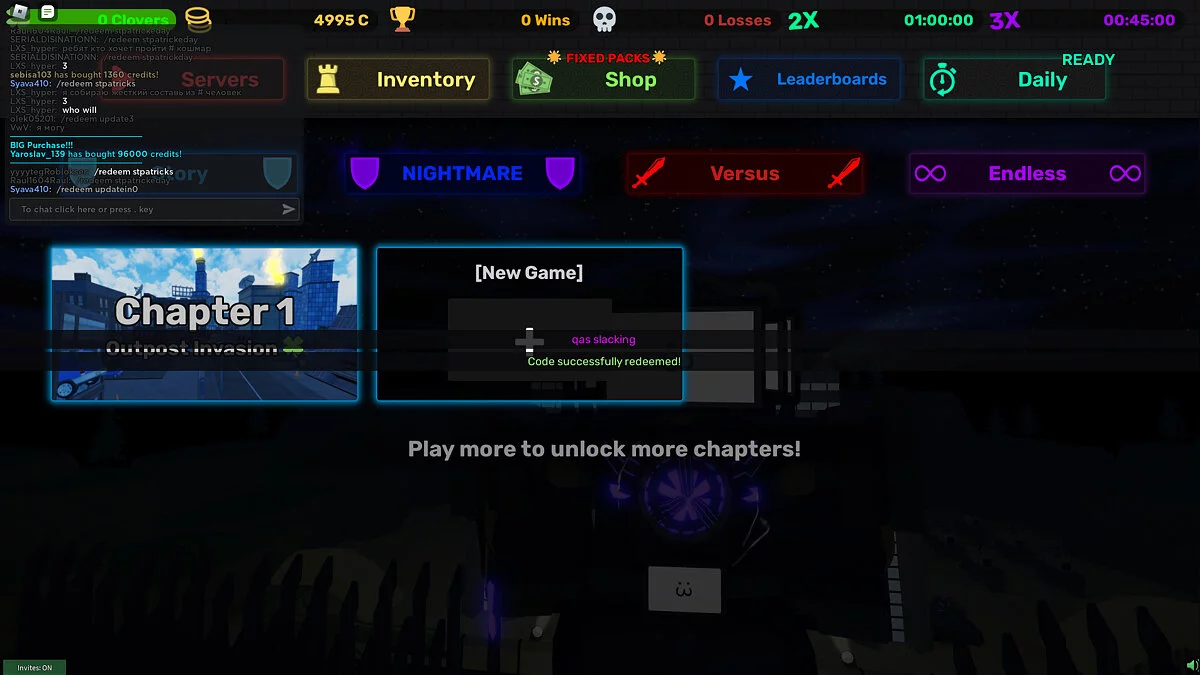 - /redeem sorryforshutdowns — Используйте код для получения 3-часового усиления в 2 раза и 3 000 кредитов.