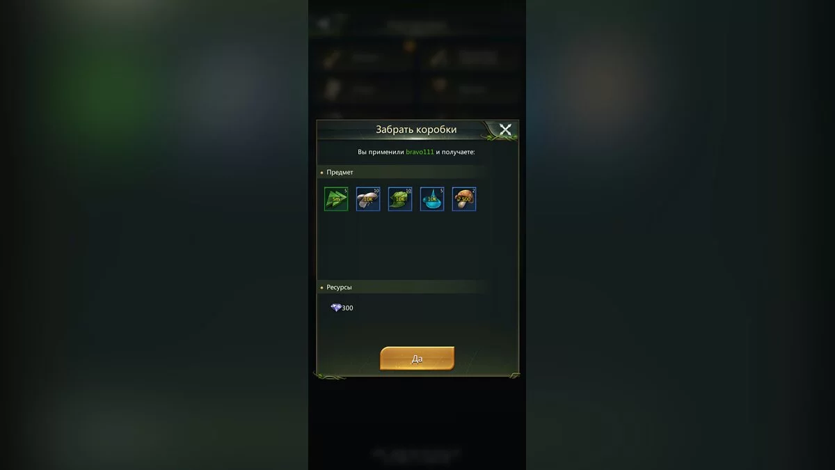- bravo111 — 300 бриллиантов, 10 000 еды (x3), 10 000 листьев (x3), 10 000 воды (x3), 2500 грибов (x3) и 5 ускорений (5 минут);