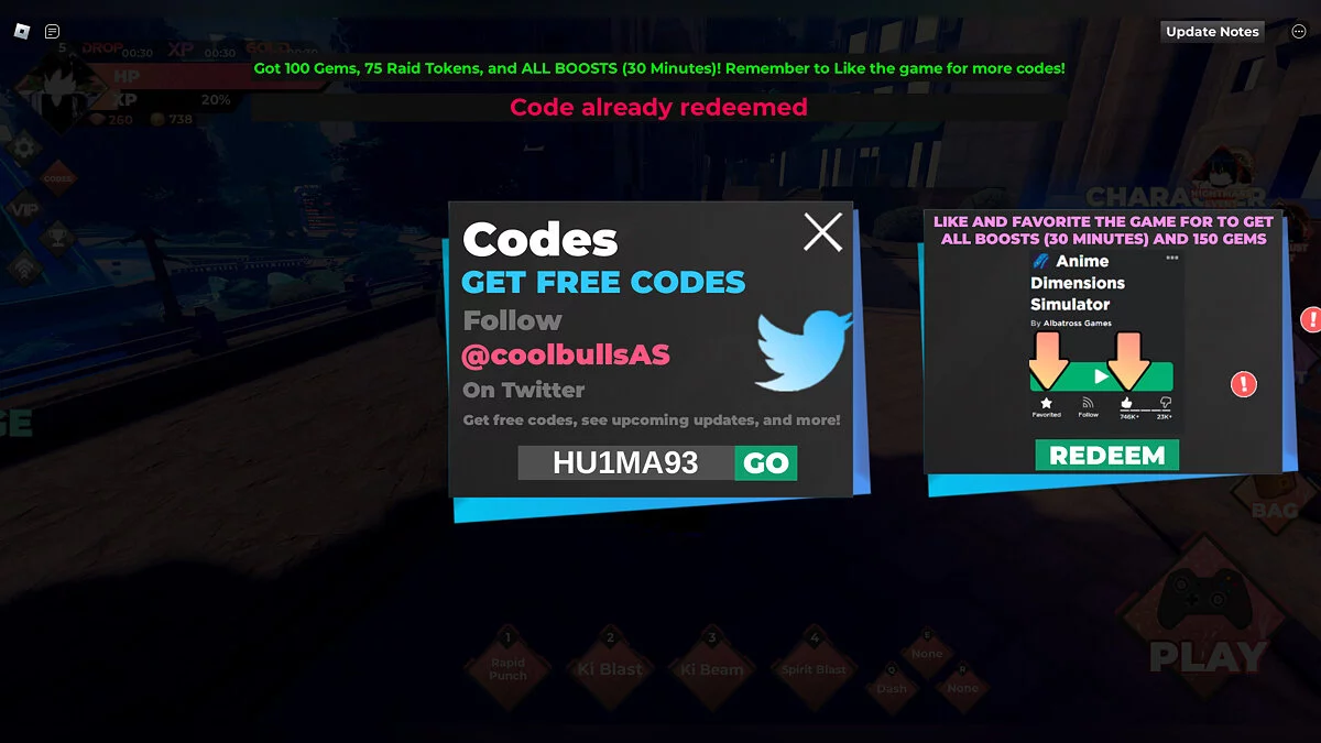 - HU1MA93—Активируйте для получения 100 драгоценных камней, 75 рейдовых жетонов и всех усилений на 30 минут;