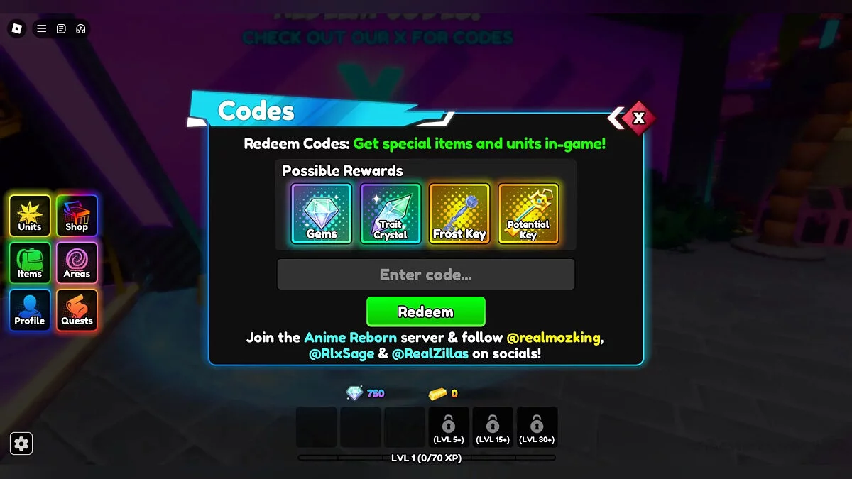 Активация кодов выполняется после входа в игру в любое время. Чтобы активировать код в Anime Reborn на Roblox, выполните следующие шаги: