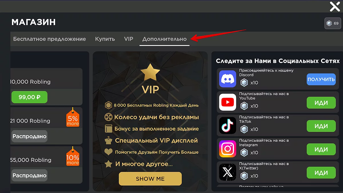 Роблинги – основная внутриигровая валюта, вокруг которой сосредоточен весь геймплей. Эти деньги можно потратить на косметические улучшения или вывести их в рублоксы. Прокрутка – в игре есть колесо удачи, с помощью которого можно выиграть роблинги.