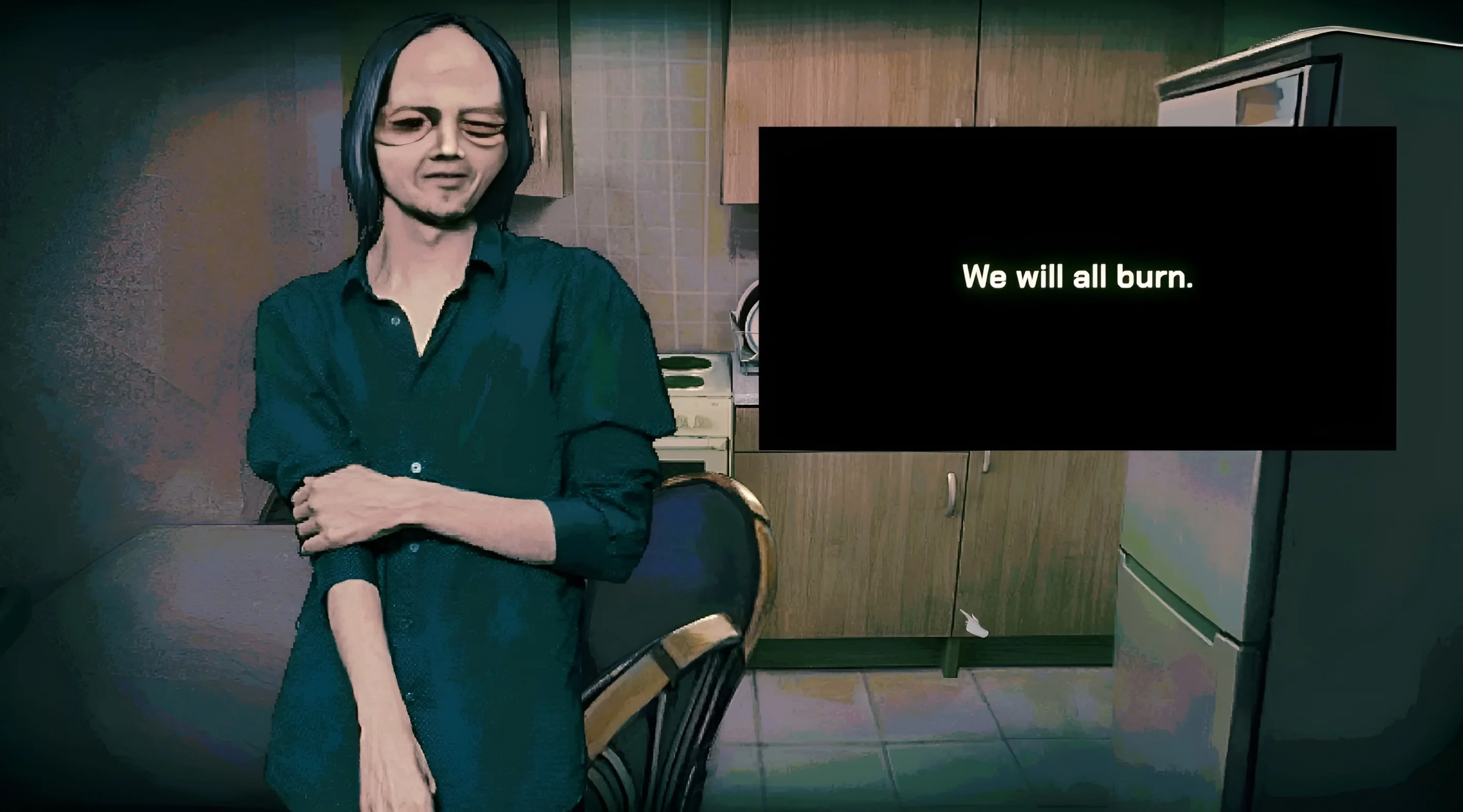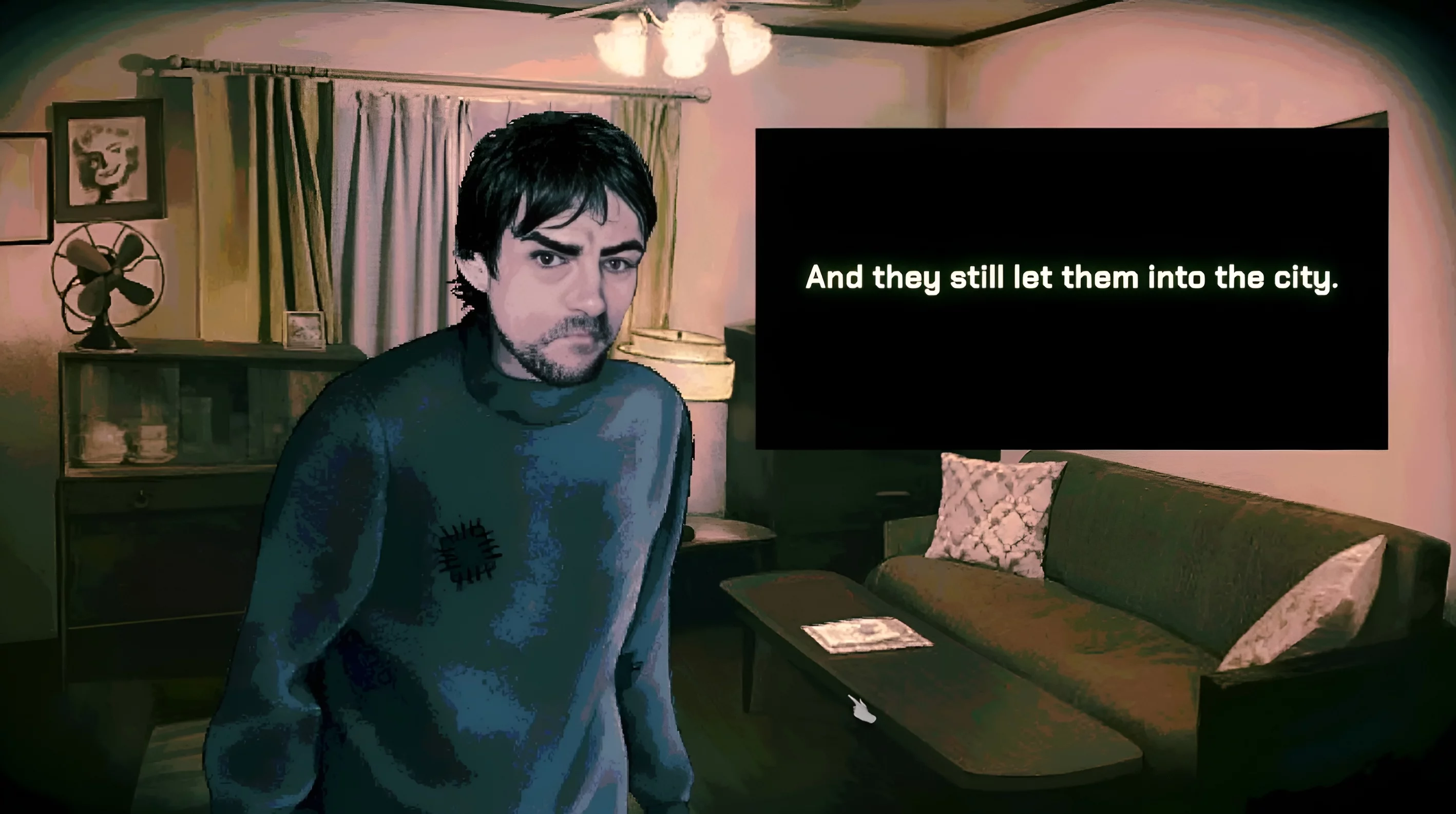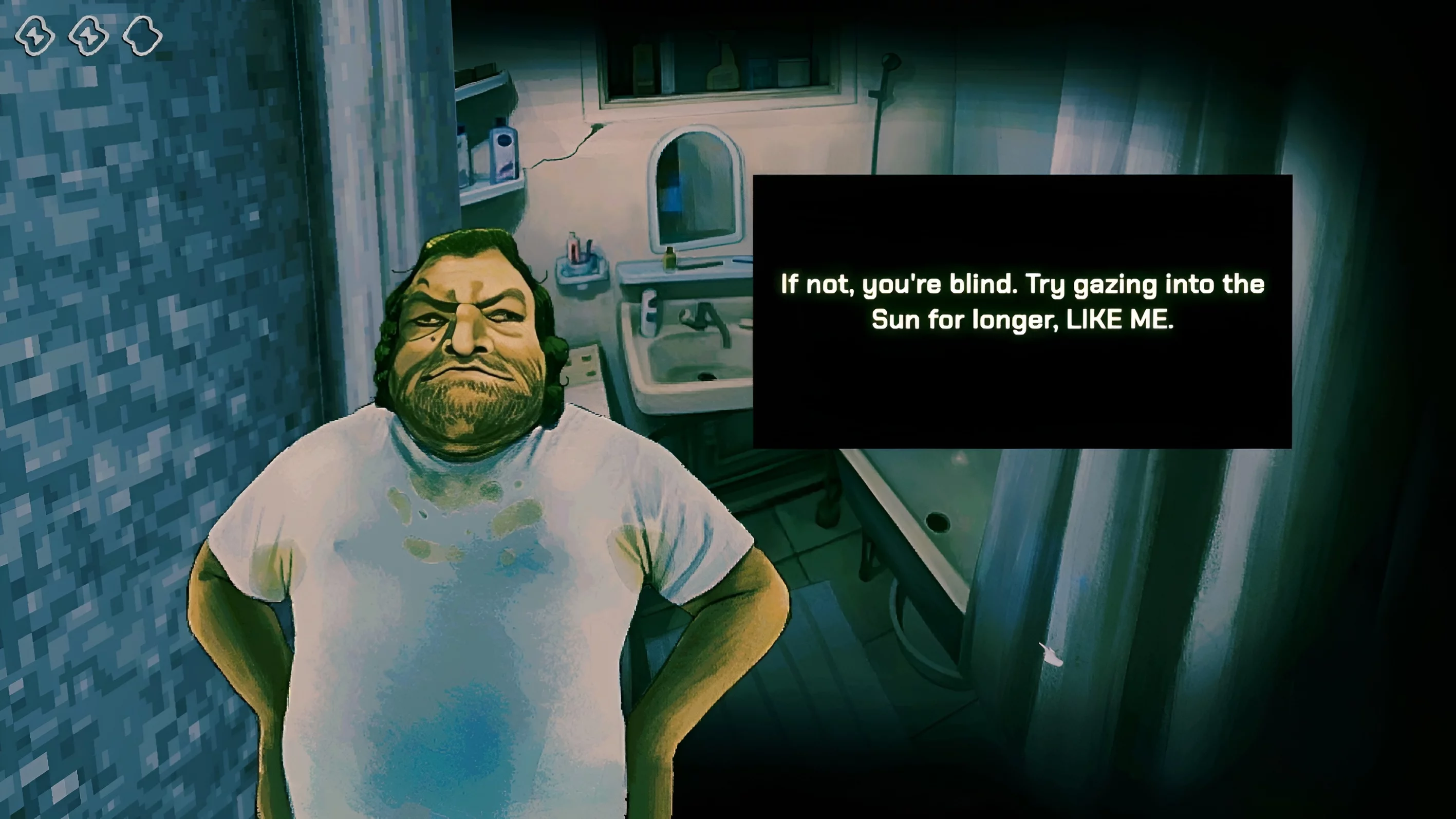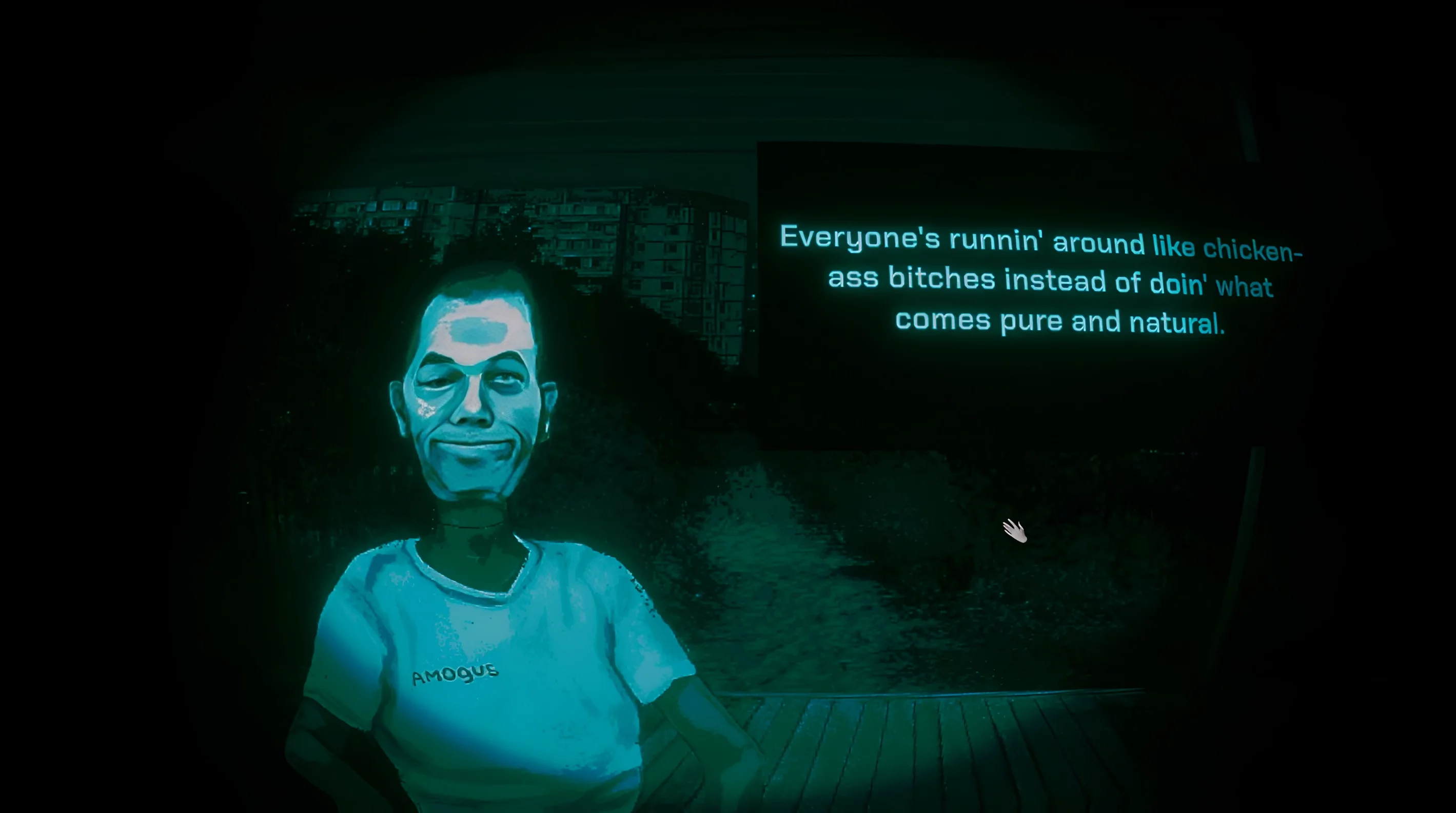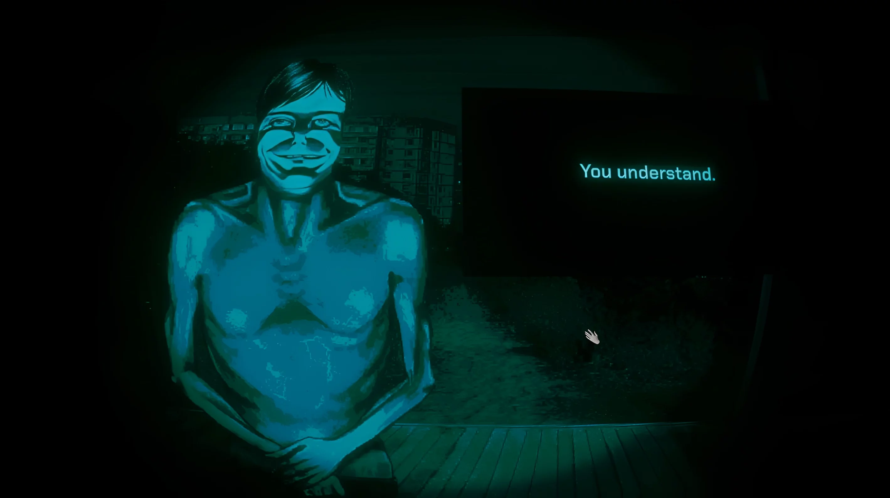 Слепой человек в вашем доме лишил себя зрения по собственному желанию. Всё из-за того, что он увидел нечто невероятно кошмарное. Это явный намёк на произведения Говарда Филлипса Лавкрафта, где подобные ситуации случались регулярно. О каком веществе идёт речь в игре — точно неизвестно. Возможно, именно его тень вы можете увидеть на улице. А ещё о нём упоминают по местному радио и призывают не сжигать тела, чтобы избежать лишнего внимания со стороны этой твари.