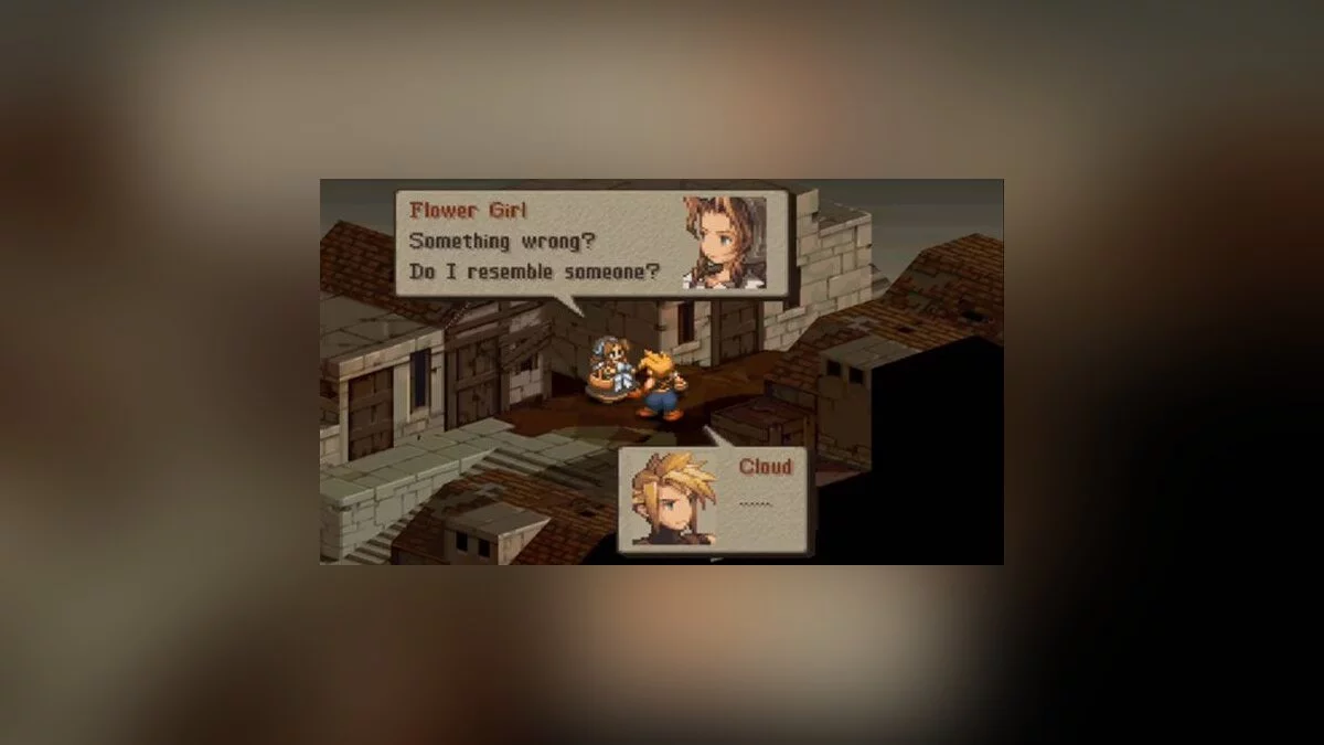 В игре Final Fantasy Tactics в 4 главе, если вы сделайте целую кучу различных шагов, можно открыть временной портал и вытащить из другого времени Клауда Страйфа, что приведет к встрече последнего с продавщицей цветов. Дело в том, что на нее напали бандиты, один из которых думал, что она продает не только цветы, но и свое тело. Ужас.