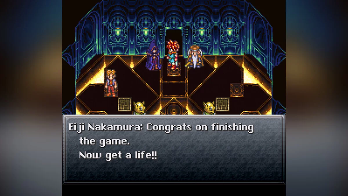 Вы когда-нибудь мечтали встретиться с разработчиками игры Chrono Trigger? Если да, то такая возможность есть, в каком то смысле. После того, как вы пройдете игру и начнете «Новую Игру Плюс» (Такой режим часто встречается в разных играх и подразумевает второе прохождение с дополнительными возможностями), то откроются новые ворота в правой части Площади Лиин. Зайдите туда в самом начале новой игры и сразитесь с Лавосом, усиленным в два раза. Если получится, то вы найдете комнату с виртуальными разработчиками. «А теперь займись реальной жизнью!», — говорит нам Еджи Накамура (Eiji Nakamura).