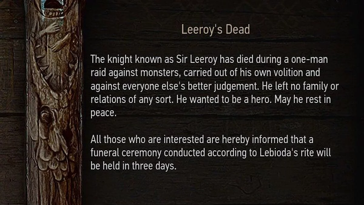 На доске объявлений в новых землях Туссента находится объявление, которые рассказывает нам о несчастной гибели Лироя. Там говорится, что он погиб во время боя одного человека против толпы монстров, проводил он этот бой по собственной воле и против здравого смысла всех остальных.