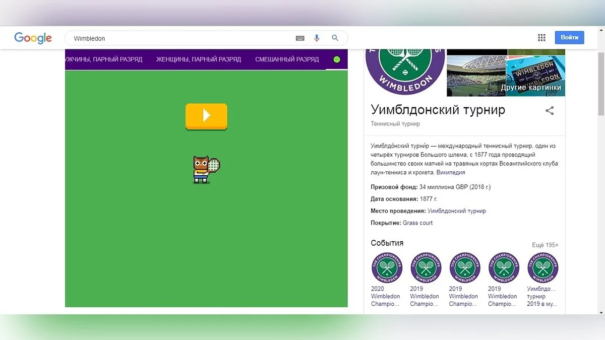 Для того, чтобы сыграть в своеобразный рескин пинг-понга, нужно набрать в поисковике Wimbledon. Сразу под строкой появится таблица с итогами матчей, а в середине таблицы будут категории — выбранной категорией изначально будет «Мужчины, одиночный разряд». Категории нужно листать вправо (взять мышкой и тянуть справа налево) до упора, пока в категориях не появится маленький зелёный (теннисный) мячик. На него и нужно нажать.
