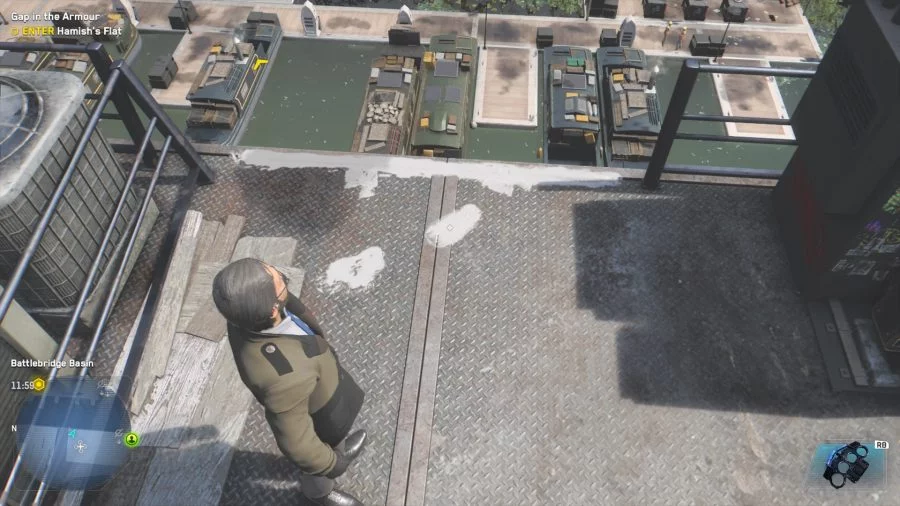 Вы обязательно столкнетесь с этим местом в одном из сюжетных заданий. Во время миссии «Брешь в броне» (Gap in the Armor) вы должны взломать квартиру бывшего сотрудника Альбиона. В конце миссии вы должны нырнуть в реку. Единственный способ сделать это — совершить «Прыжок веры» с крыши. Это явный намек на серию Assassin's Creed. Вы услышите крик орла, когда сделаете прыжок.