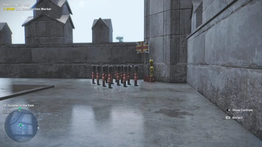 Отправляйтесь в церковь Святого Дунстана на Востоке (St. Dunstan-in-the-East church), которая находится на полпути между Лондонским мостом и лондонским Тауэром. При помощи дрона взлетите на вершину шпиля. Зайдите внутрь, чтобы увидеть маленькие деревянные фигурки королевской гвардии Великобритании. Одна из фигурок золотая.