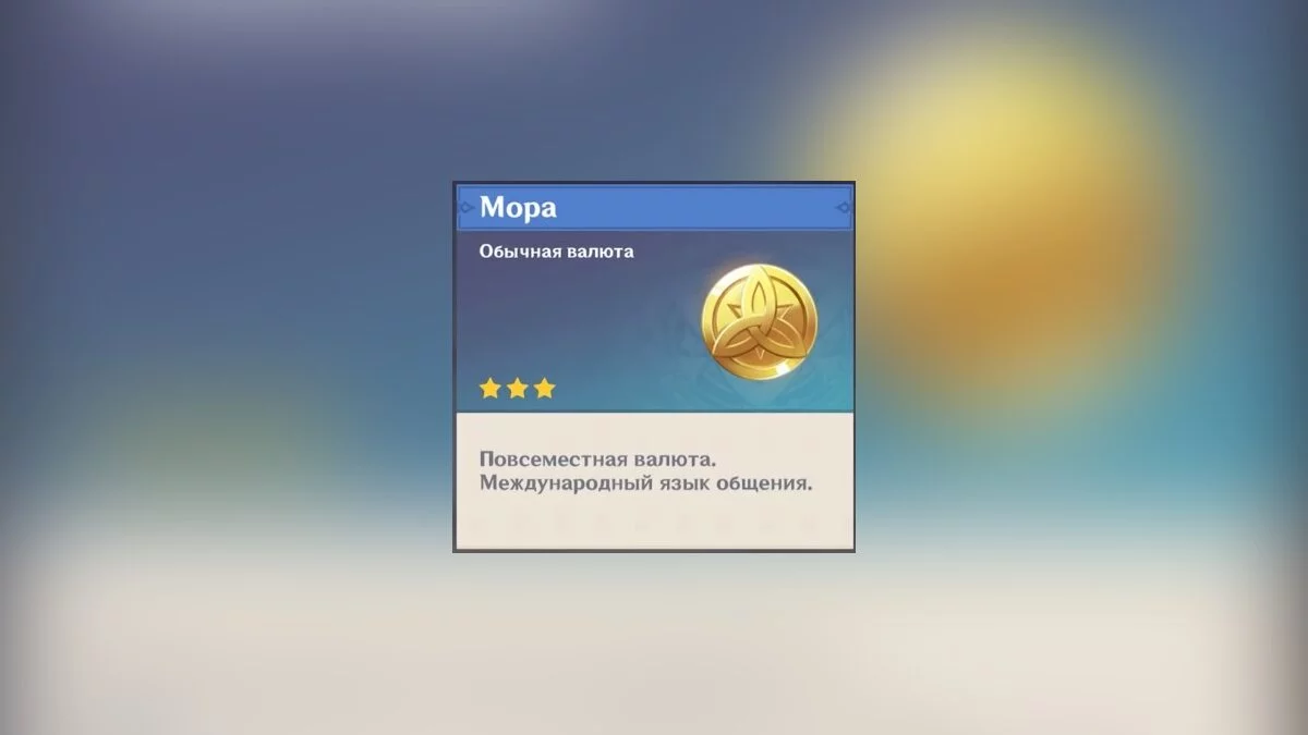 Мора — игровое золото — основная внутриигровая валюта. Она тратится на покупку различных предметов в магазинах. Мору можно получить за выполнение квестов, победу над монстрами или найти в сундуках. Можно купить за печати и звездную пыль.