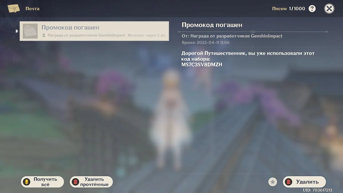 Чтобы забрать награду в игре, откройте меню Паймон и выберите раздел «Почта». Обычно подарочные письма появляются сразу после активации.