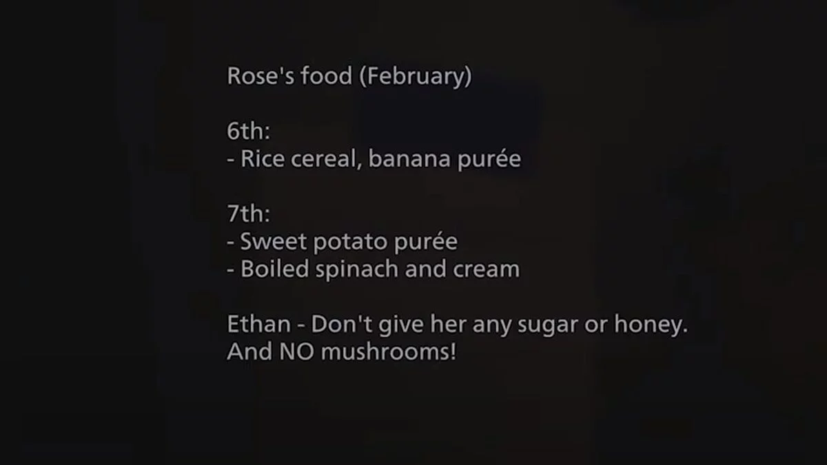 На холодильнике в начале игры можно найти список еды для Розы. Мия отдельно выделяет, чтобы Итан ни в коем случае не давал ей грибы. Это возможная отсылка к событиям седьмой части Resident Evil, где заражение началось из-за особой плесени. В живой природе существует масса различных плесневых грибов, активно используемых человеком в производстве. После всех перенесённых ужасов, нет ничего удивительного, что этот продукт в молодой семье под запретом.