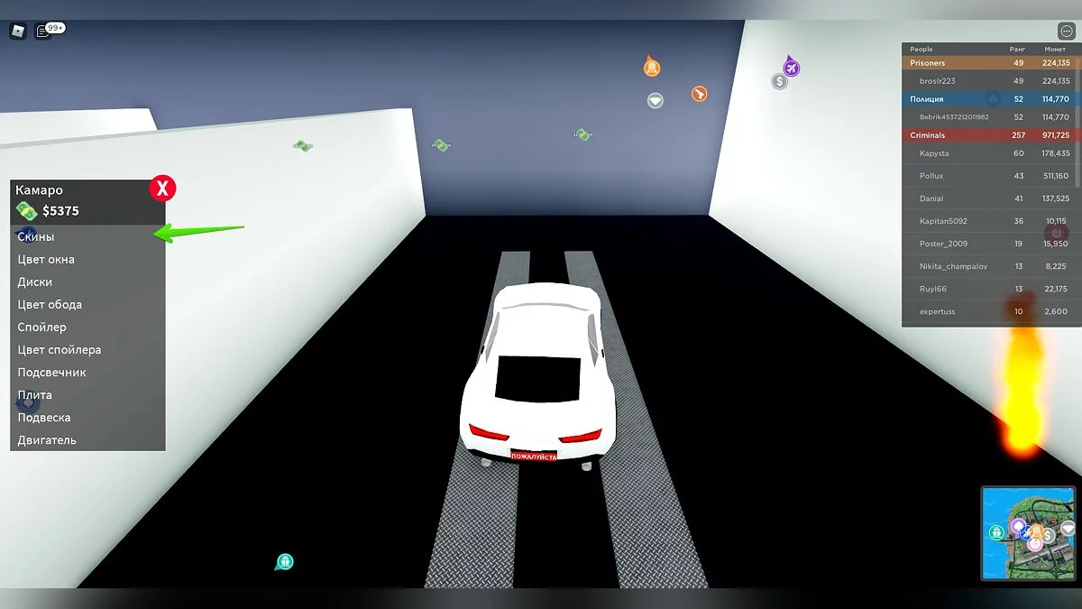 Отправляйтесь на значок гаечного ключа (синий) и загоните автомобиль в гараж. Сядьте в транспорт, после чего откроется меню выбора скинов. Здесь вы можете установить любой имеющийся скин или приобрести новый.