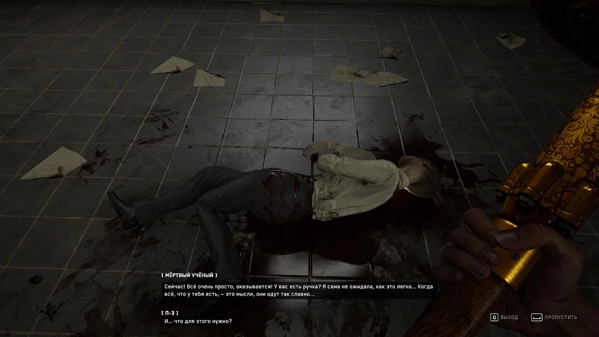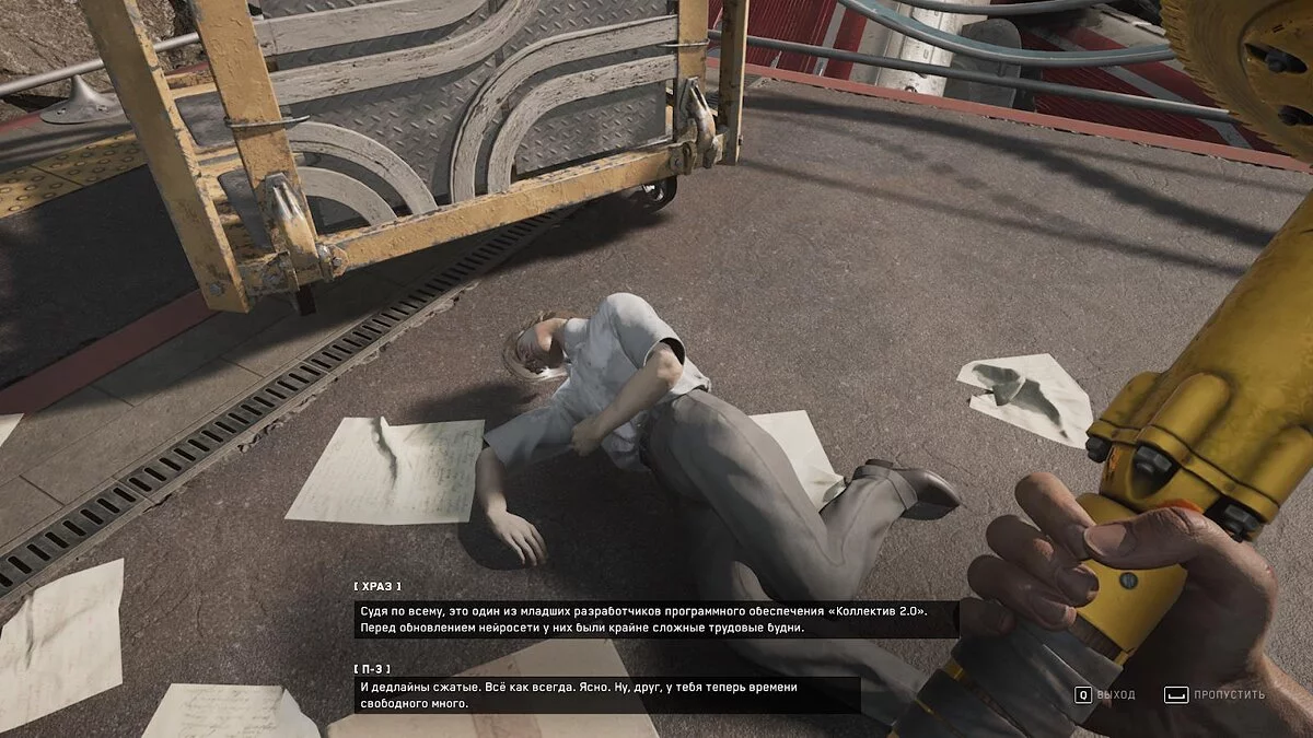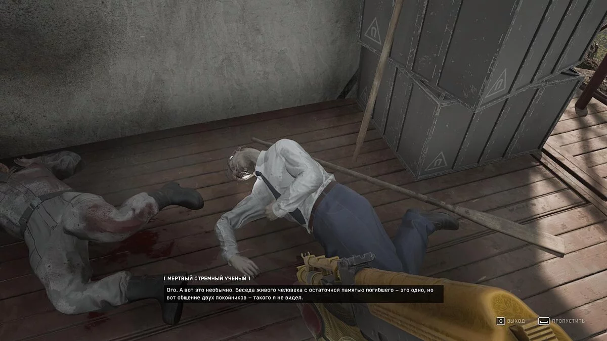 Относительно недалеко от прошлого места лежит ещё один труп, который также будет спойлерить, утверждая, что П-3 уже мёртв.