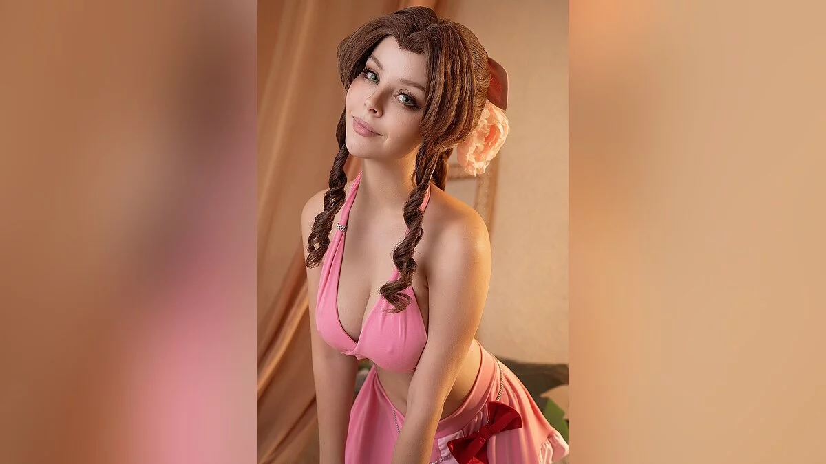 Во второй части ремейка Final Fantasy 7 мы увидели Айрис в розовом купальнике. Причём в игре есть возможность закрутить роман. Для этого нужно выполнять совместные удары во время сражений, выбирать правильные ответы в диалогах и проходить побочные задания. В результате девушка проникнется чувствами к главному герою Клауду. Косплей на Айрис сделала Helly Valentine.
