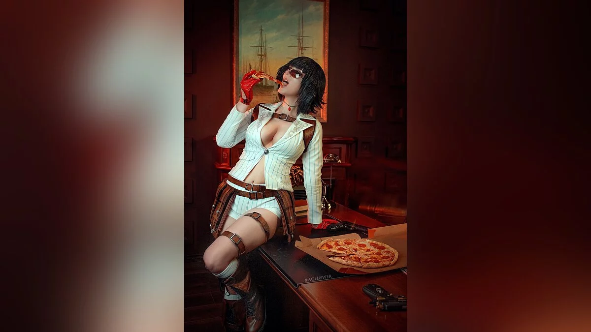 Я — фанатка ранних Devil May Cry. На мой взгляд, в пятой части неповторимый вайб Леди потерялся. Поэтому я решила сделать косплей по мотивам DMC 4. Чего только не сделаешь, чтобы покушать вкусную пиццу на фотосете!