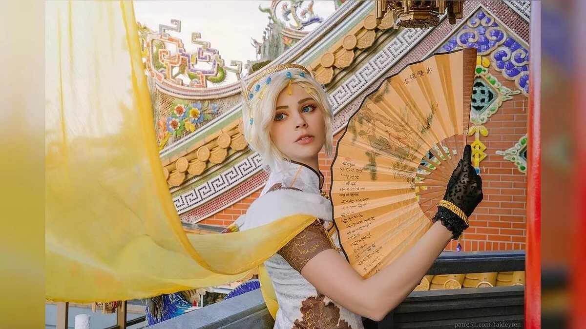 Faid Eyren сделала косплей на Мерси из Overwatch в альтернативном скине по мотивам фанатского арта. Для этого образа девушка сшила традиционное китайское платье ципао. Фотограф — Mirn. Ретушь — Nami Yamane.