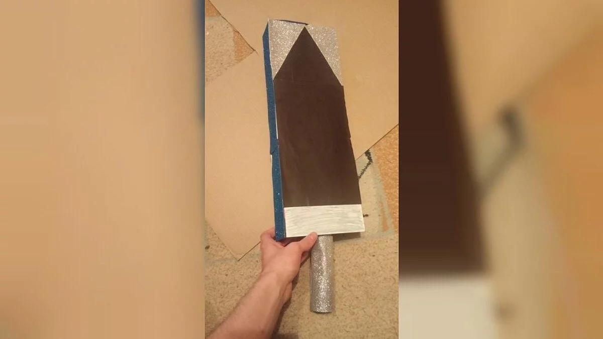 Вставляем эфес в «клинок». Смотрим, чтобы ничего не болталось. Обклеиваем клинок со всех сторон картоном и при помощи всё той же бумаги изображаем очертания лезвия — или просто рисуем их. Эфес тоже обклеиваем блестящей, будь она неладна, бумагой, чтобы скрыть истинную суть веника. Меч-кладенец готов.