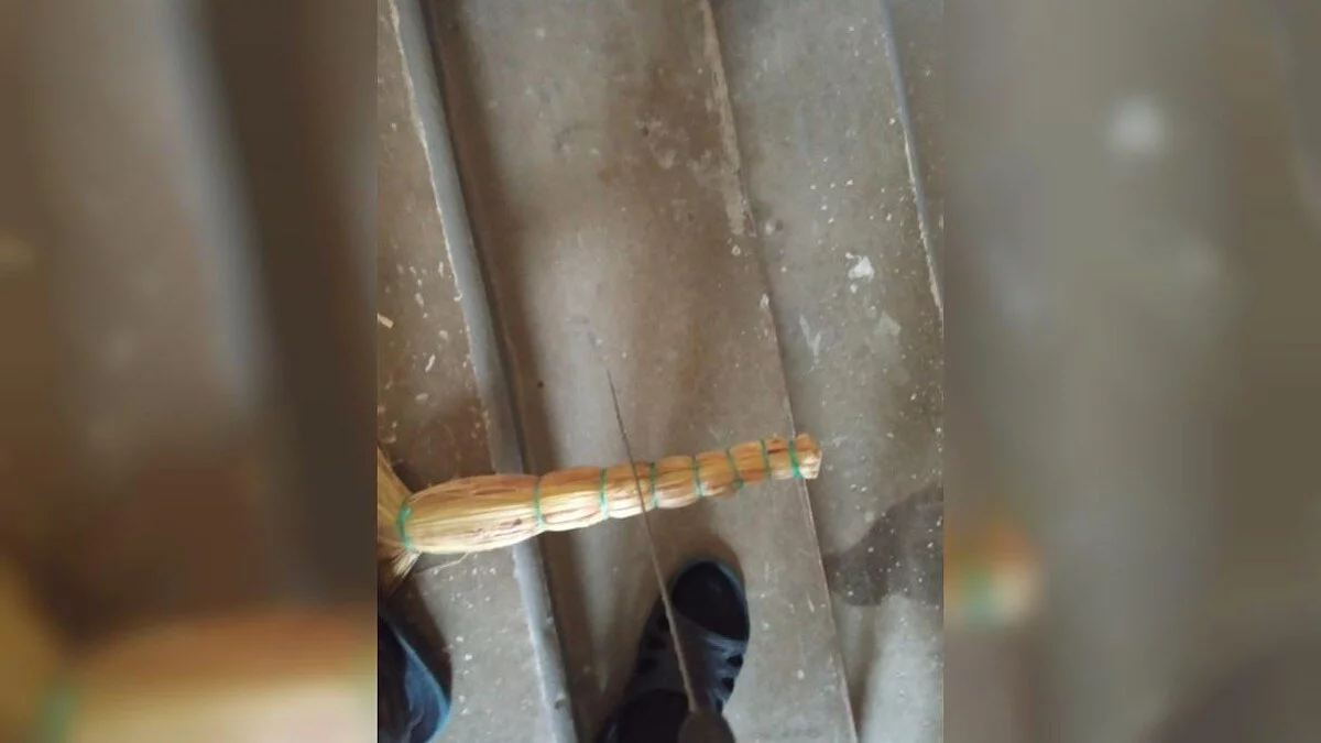 Вытряхиваем мусор, плотно закрываем, примеряем. Размер отличный, значит, можно делать отверстие для эфеса. На него пойдёт веник, которому нужно отпилить ручку.